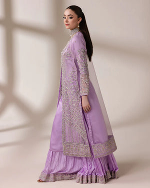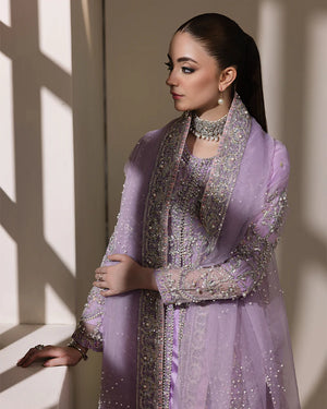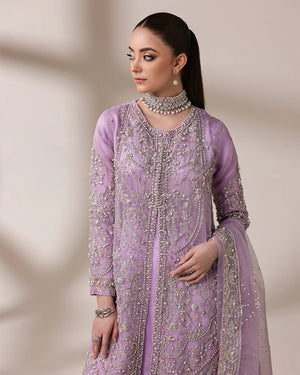 Organza cape crafted with stunning chainwork, intricate sequin embroidery with pearls, crystals, and captivating 3D embellishments