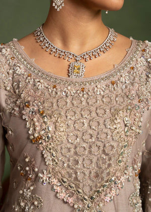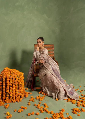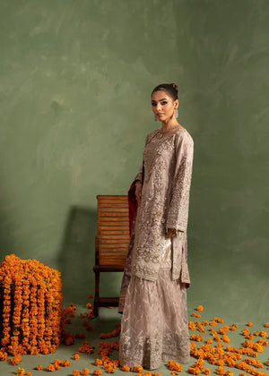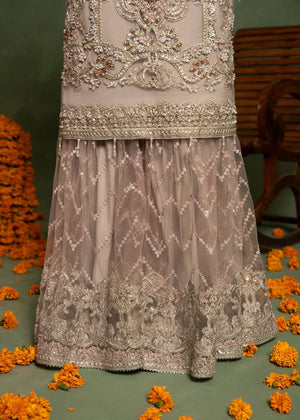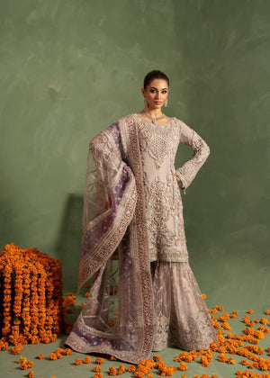 Additional Description: "*Shirt fabric Net *gharara fabric net with jamawar upper body * Dubbata fabric NET *Lining viscouse * 3pc stitched suit *Multihead embriodery and handmade aada stone and pearl work on it *Trouzer with embriodered border *Embriodered dubbata on net and four sided organza border with embiodery."