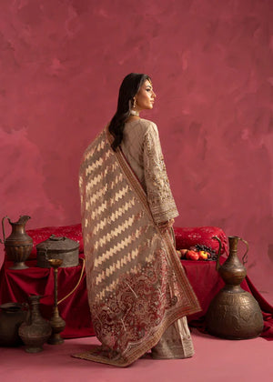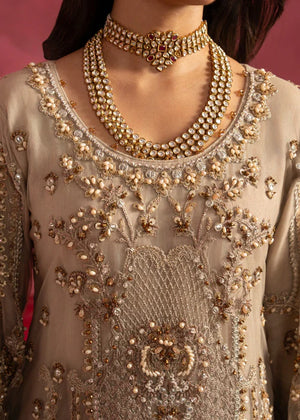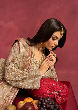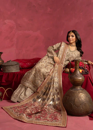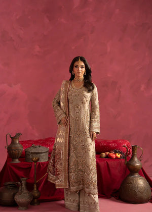 Additional Description: "*Shirt fabric Net *Trouser fabric Raw Silk * Dubbata fabric Organza lawrance *Lining viscouse * 3pc stitched suit *Multihead embriodery and handmade aada stone and pearl work on it *Trouzer with embriodered border *Embriodered dubbata on organza lawrance and four sided border with embiodery"