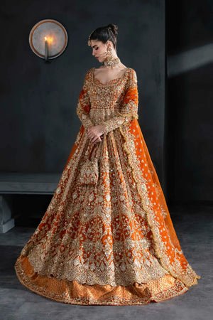 Radiate royal splendor in this vibrant orange bridal lehenga by Akbar Aslam, crafted for the bride who dares to make a bold statement. Featuring a structured neckline and full sleeves, the silhouette is drenched in intricate gold embroidery, hand embellishments, and traditional motifs that cascade into a grand flare. The heavily worked dupatta, edged with ornate scalloping, adds depth and drama to the ensemble. Finished with a matching handcrafted pouch, this look is an ode to cultural richness, perfect for a powerful and unforgettable bridal presence.