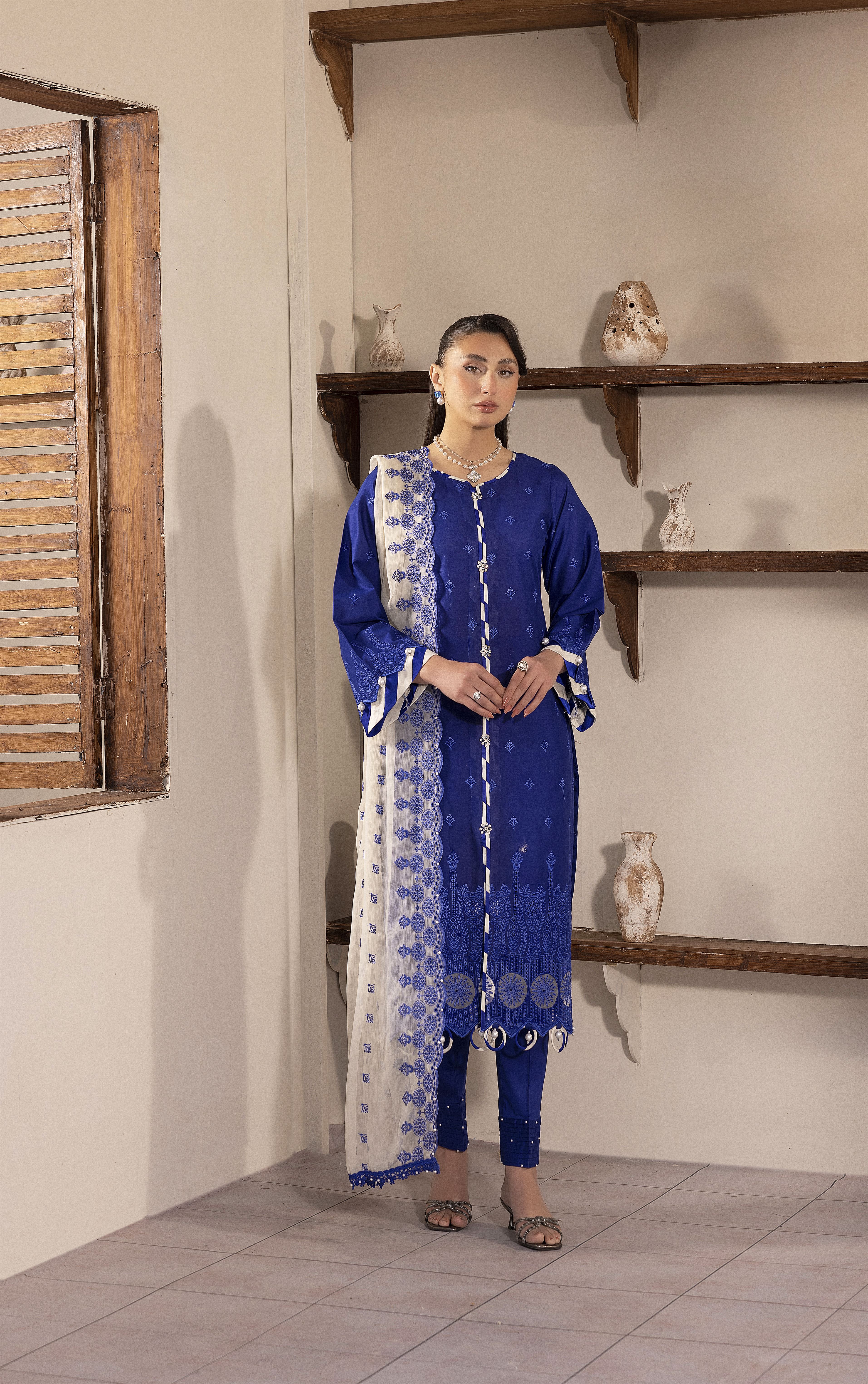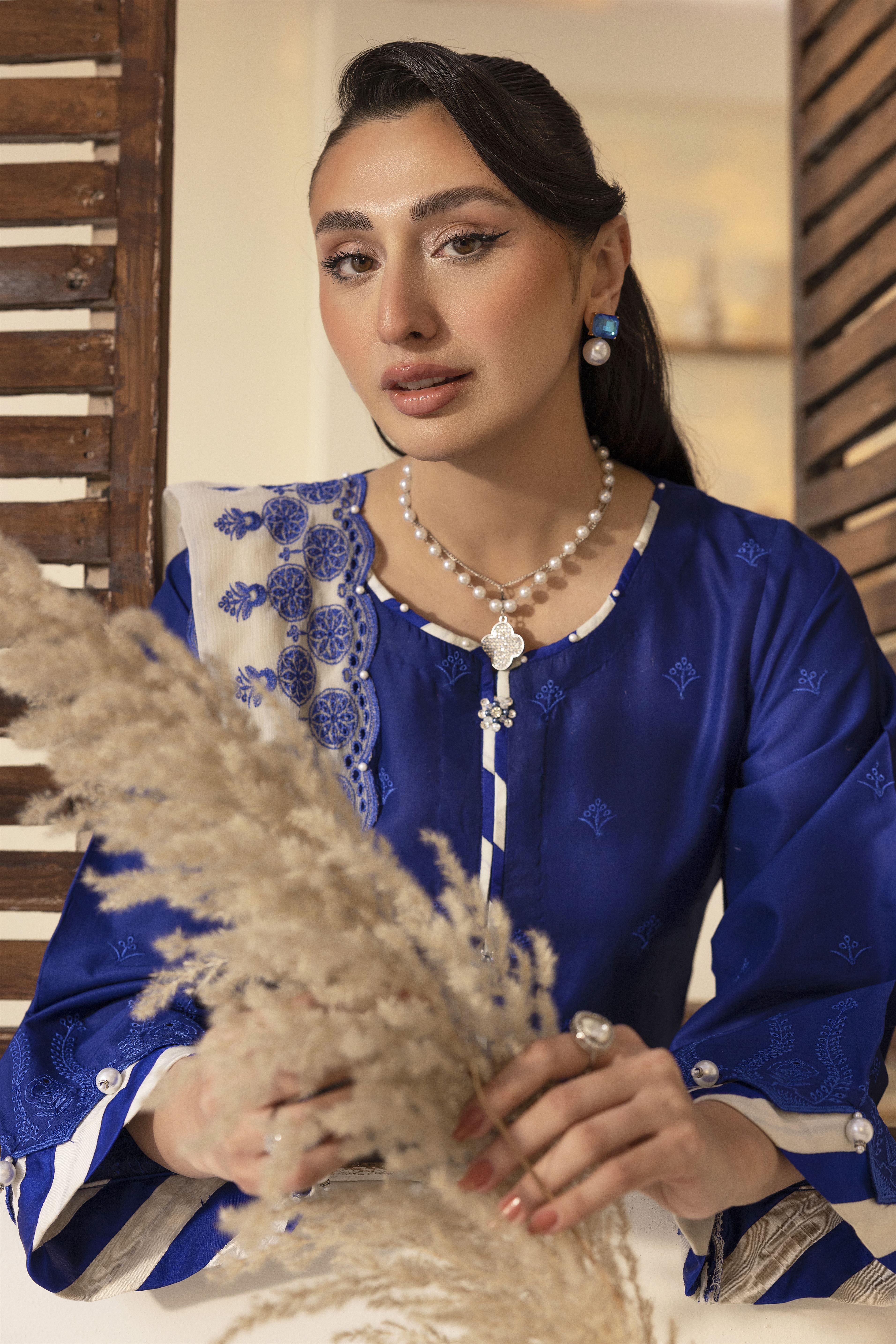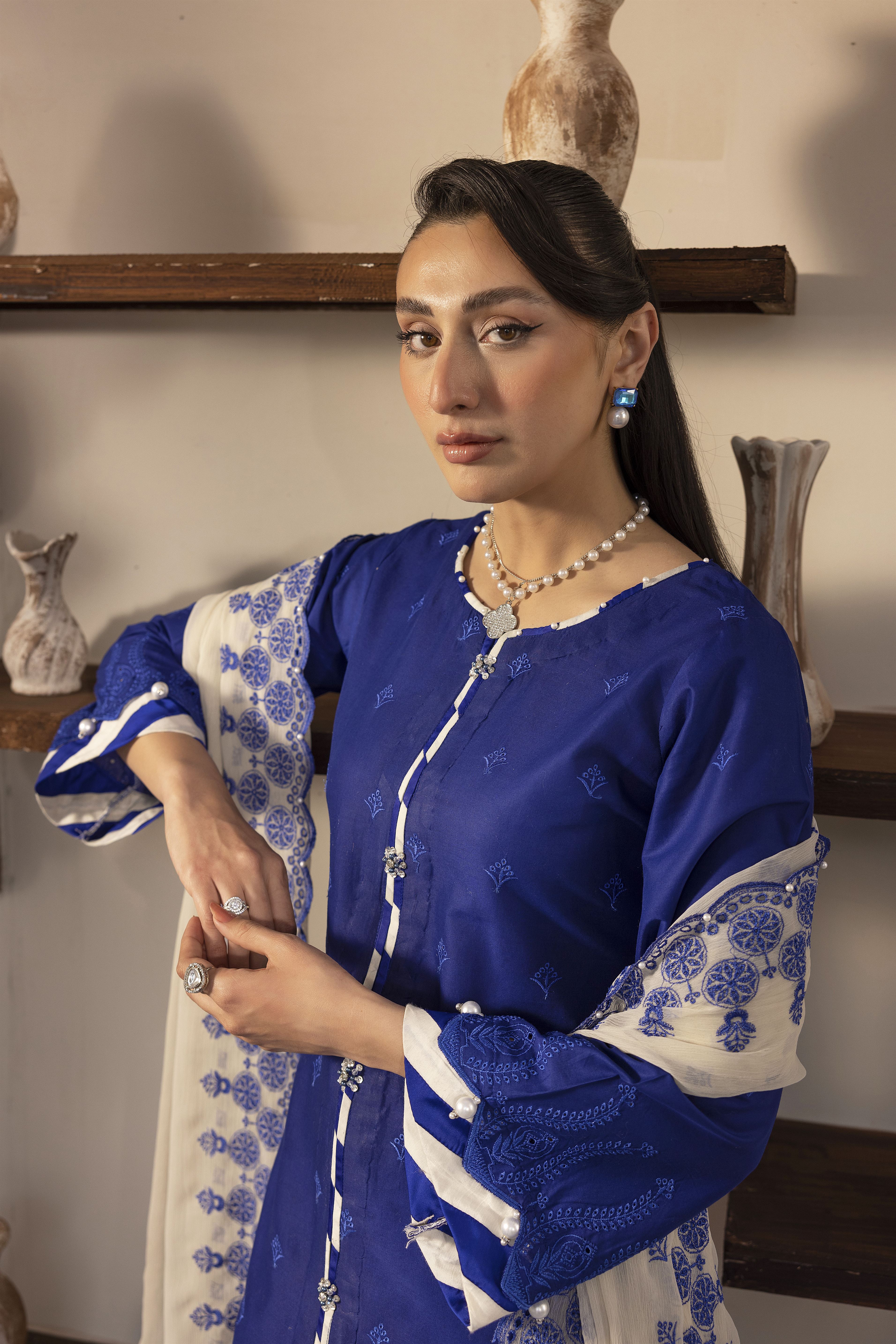 Cotton chikkankari front-open shirt Adorned with exquisite embroidery featuring organza applique work on the boarders matching pearls, and meticulously handcrafted motifs
