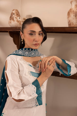 Cotton Chikkankari shirt featuring with organza applique work on the boarders meticulously crafted with intricate embroidery, adorned with delicate pearls and playful tussles