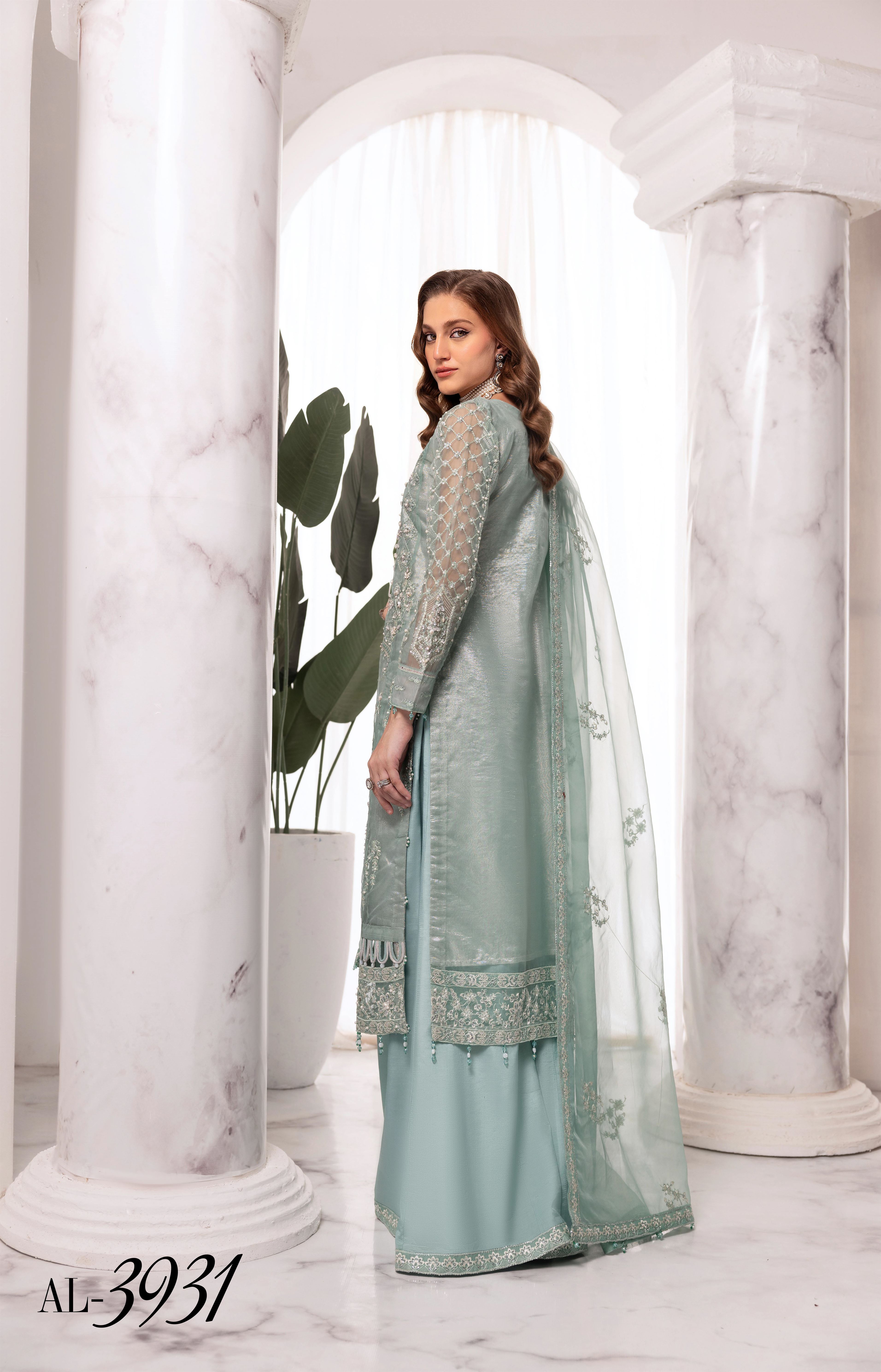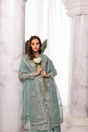 1-Introducing our stunning organza sequin embroidered shirt, adorned with exquisite handcrafted adda work and delicate pearl embellishments. The matching pearls on the border and sleeves add a touch of elegance to this already glamorous piece.