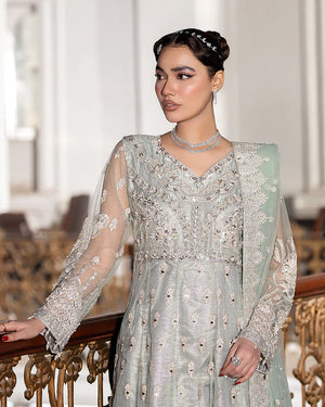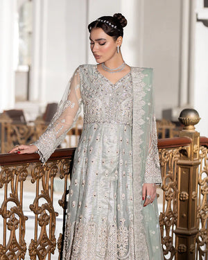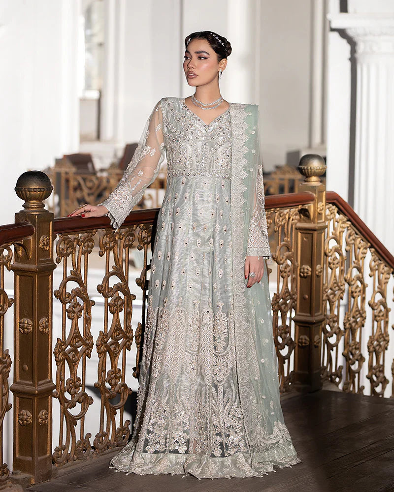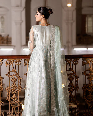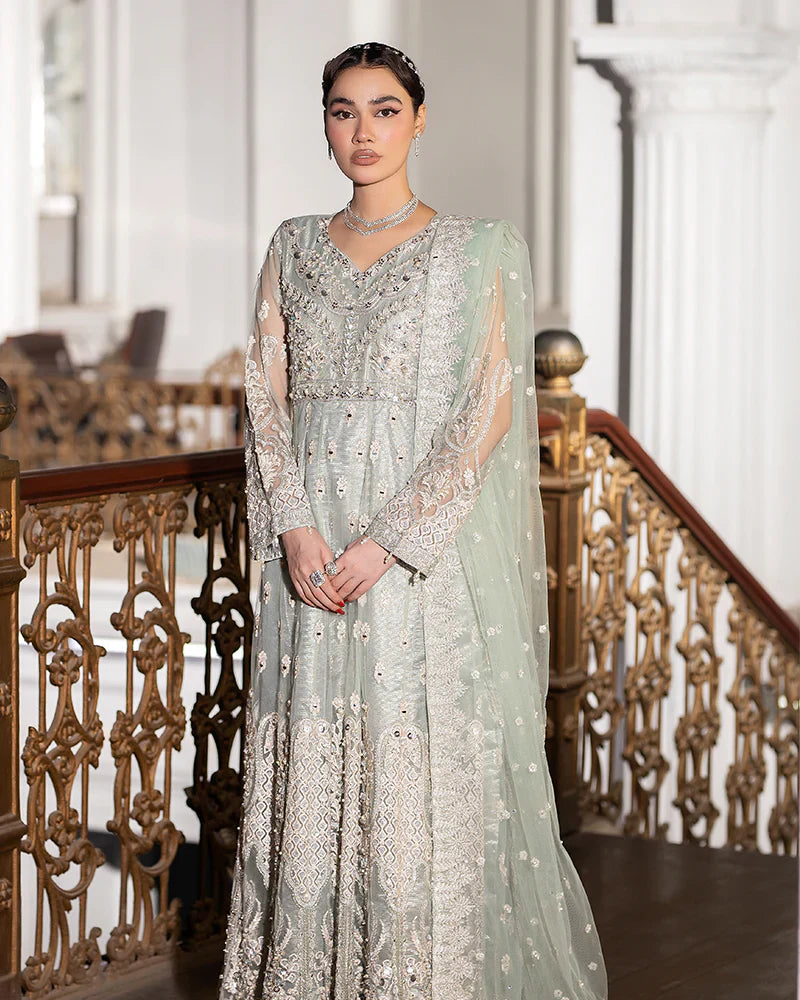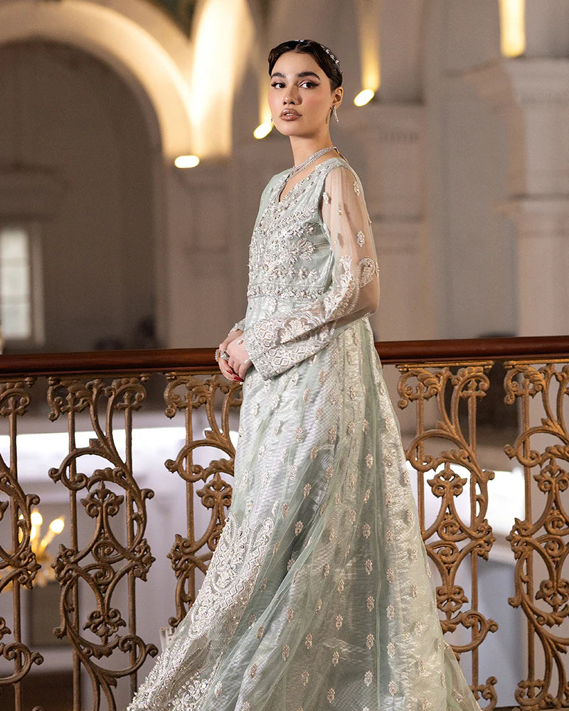 1-Net maxi adorned with intricate sequin embroidery, delicately embellished with seashells, dabka naqshi, and lustrous pearls