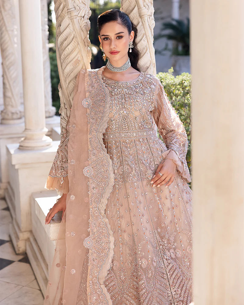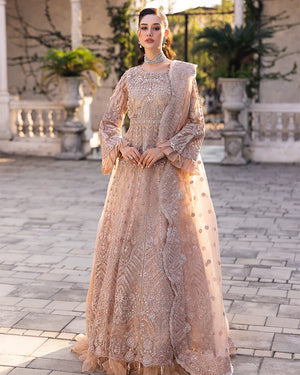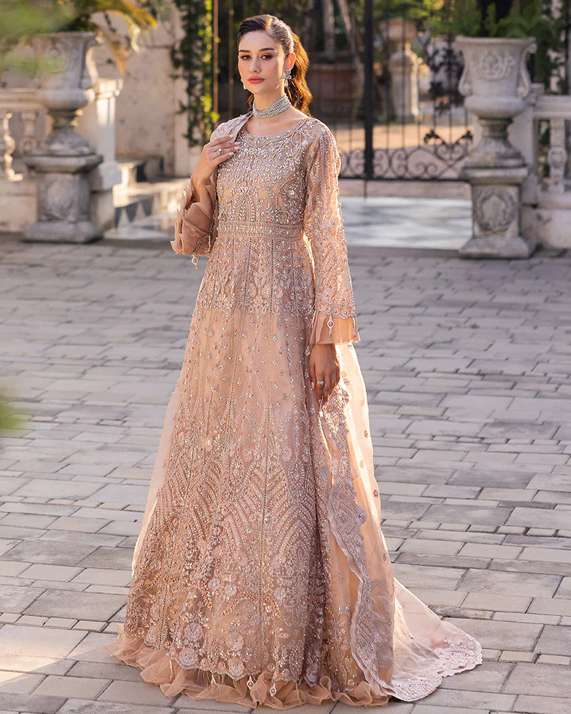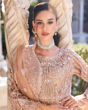 | Net Maxi adorned with glittering sequin embroidery, pearls, diamantes, chainwork, Naqshi work, crystals, organza frills, and tassels! Organza sequin embroidered dupatta, featuring delicate pearls and scalloped edges Viscose trousers |
