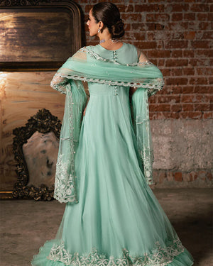 Net maxi is meticulously crafted with the finest hand-embroidered adda work, featuring intricate naqshi designs, delicate pearls, and shimmering sequin embroidery. The stunning 3D floral accents and elegant bottom frills complemented by a luxurious viscose inner lining for comfort