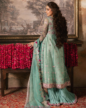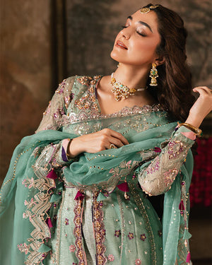 Front-open organza maxi enhance with hand crafted adda work shimmering crystals, intricate sequin embroidery, and lustrous pearls, featuring the delicate touch of adda, naqshi, and dabka craftsmanship an inner layer of shimmering fabric