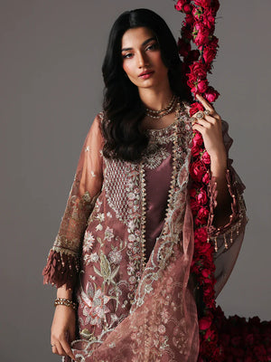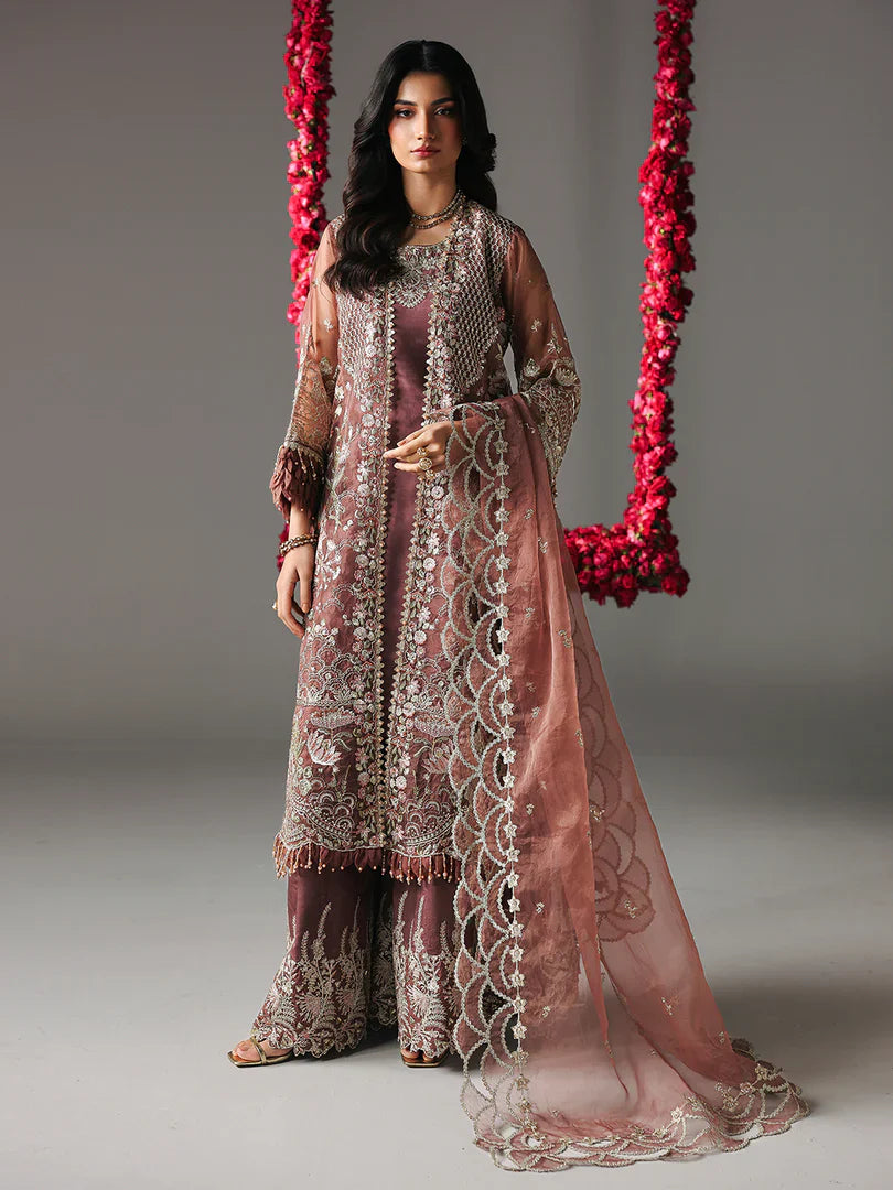 Organza gown features intricate sequin embroidery, embellished with pearls, lace accents, and tassels