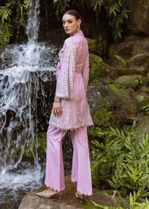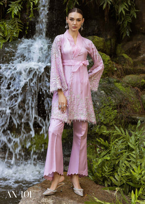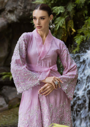 Korean silk open gown, crafted with intricate thread work, shimmering pearls, dazzling crystal embellishments, elegant chain work, and exquisite naqshi detailing.