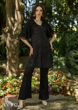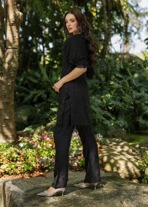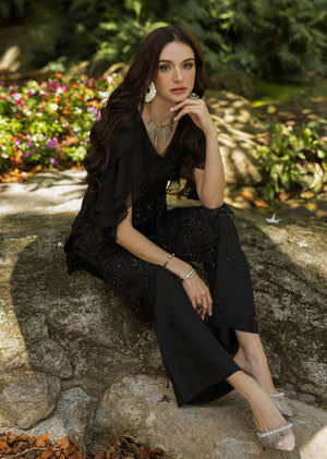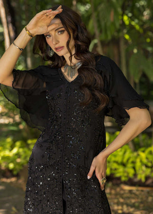 Korean Rawsilk Black Beauty Shirt, This exquisite shirt features intricate embroidery, luxurious dabka work, and shimmering sequin chain embellishments delicate chiffon frills that enhance