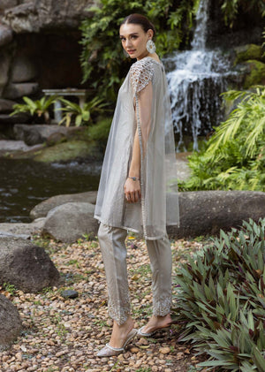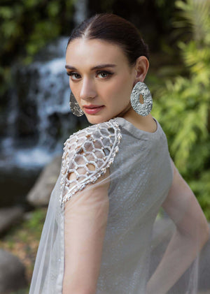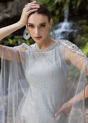 Stunning net cape, meticulously crafted with intricate embroidery work featuring naqshi, dabka, and shimmering sequins adorned with pearls.