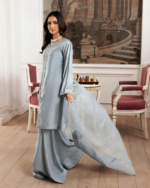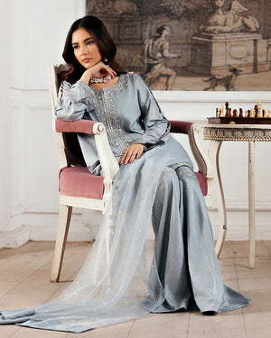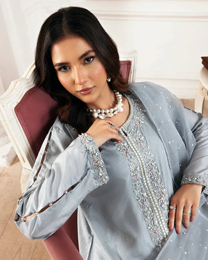 Raw silk shirt meticulously crafted with intricate chainwork, dazzling sequin embroidery, and sparkling cutdana crystals.
