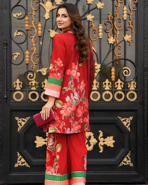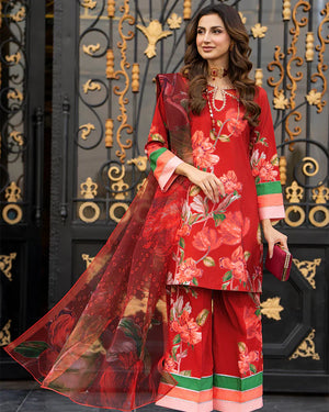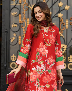 | Grip Silk Digital Print Shirt adorned with opal stone crystals and pearls on neckline and sleeves embellishments Organza Digital Printed Dupatta Grip Silk Digital Print Trouser |