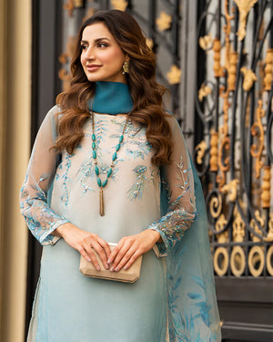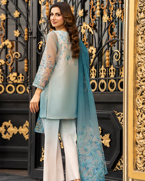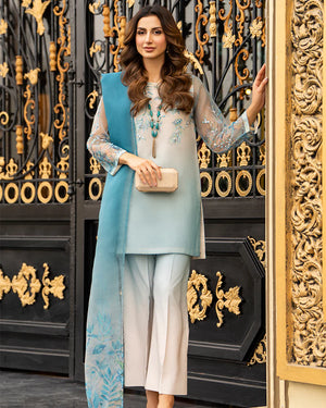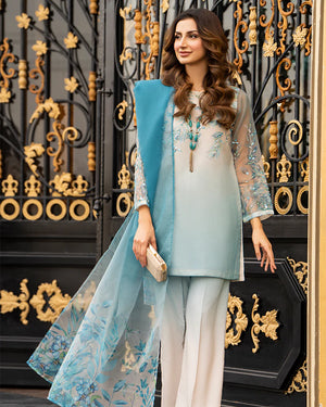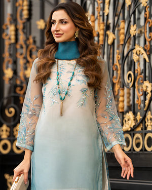 Organza digital printed shirt adorned with opal, pearls, and crystal work.