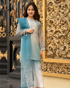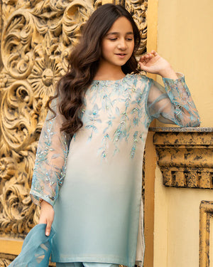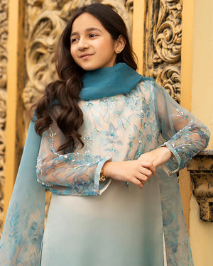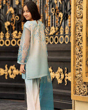 Organza digital printed shirt adorned with opal, pearls, and crystal work.