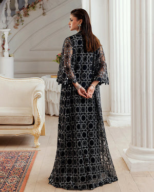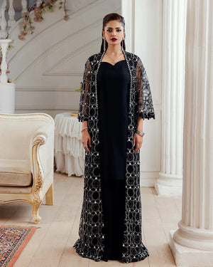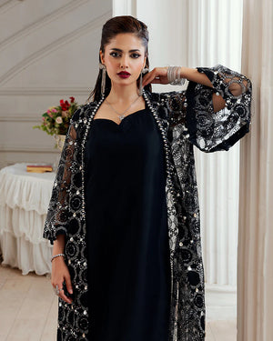 Net cape is meticulously crafted with a combination of seashells, crystals, sequin embroidery, pearls, and stones.