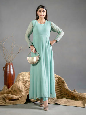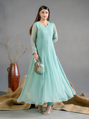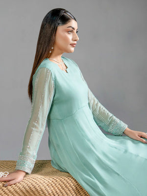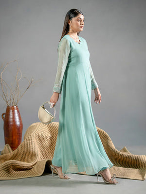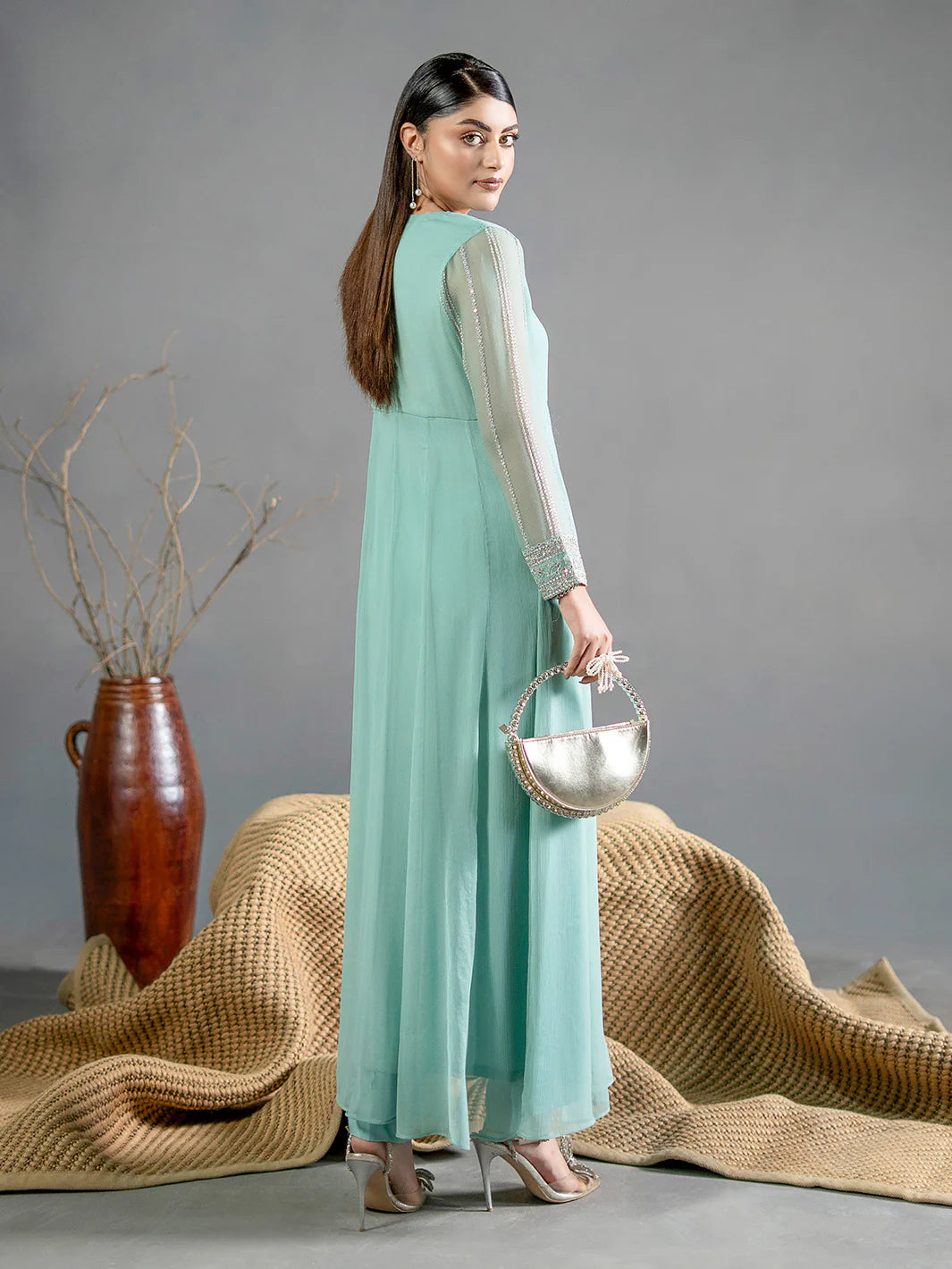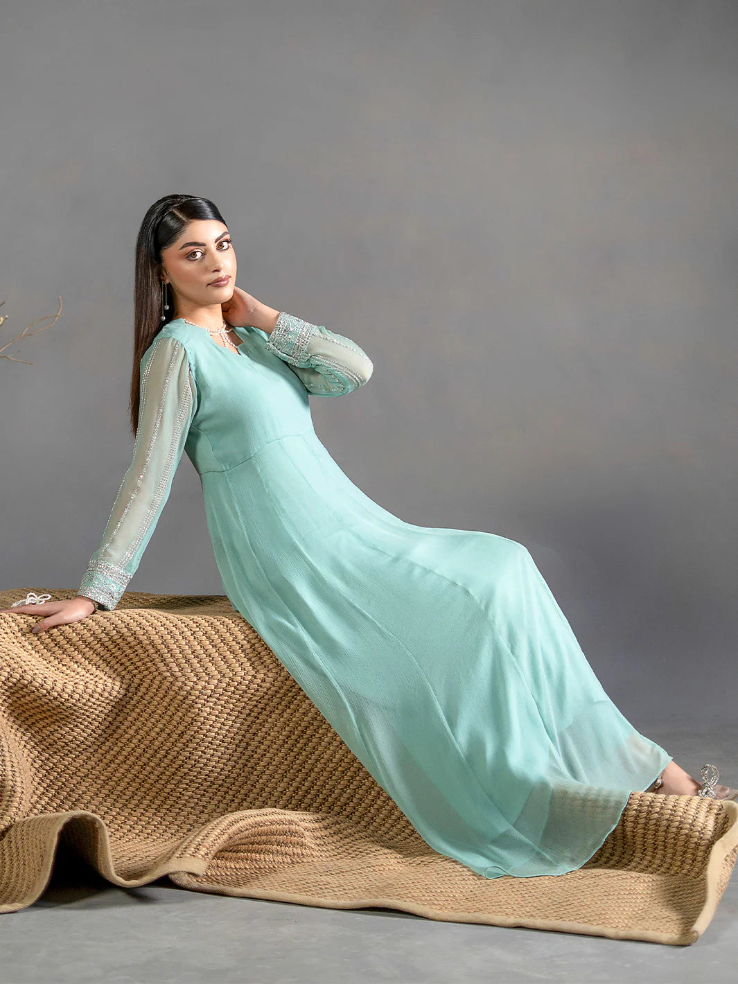 Stunning chiffon maxi adorned with sparkling spangle embroidery, shimmering stones and luxurious pearl embellishments