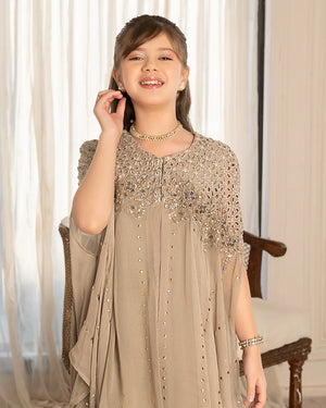 Chiffon chikankari cape, adorned with intricate handcrafted embellishments and dazzling mukesh work. Don't miss out on this must-have addition to your wardrobe!"