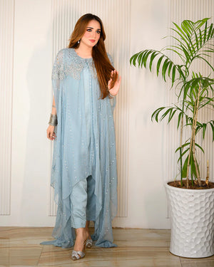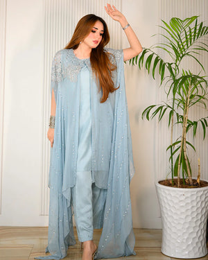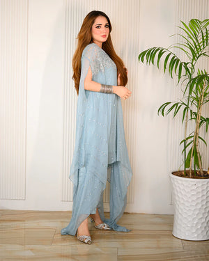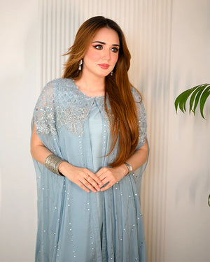 Chiffon chikankari cape, adorned with intricate handcrafted embellishments and dazzling mukesh work.Don't miss out on this must-have addition to your wardrobe!"