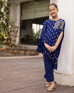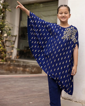 Behold the exquisite chiffon sequin embroidered drop corner cape, adorned with hand-crafted adda work and beautiful tassels cascading from the cape's bottom