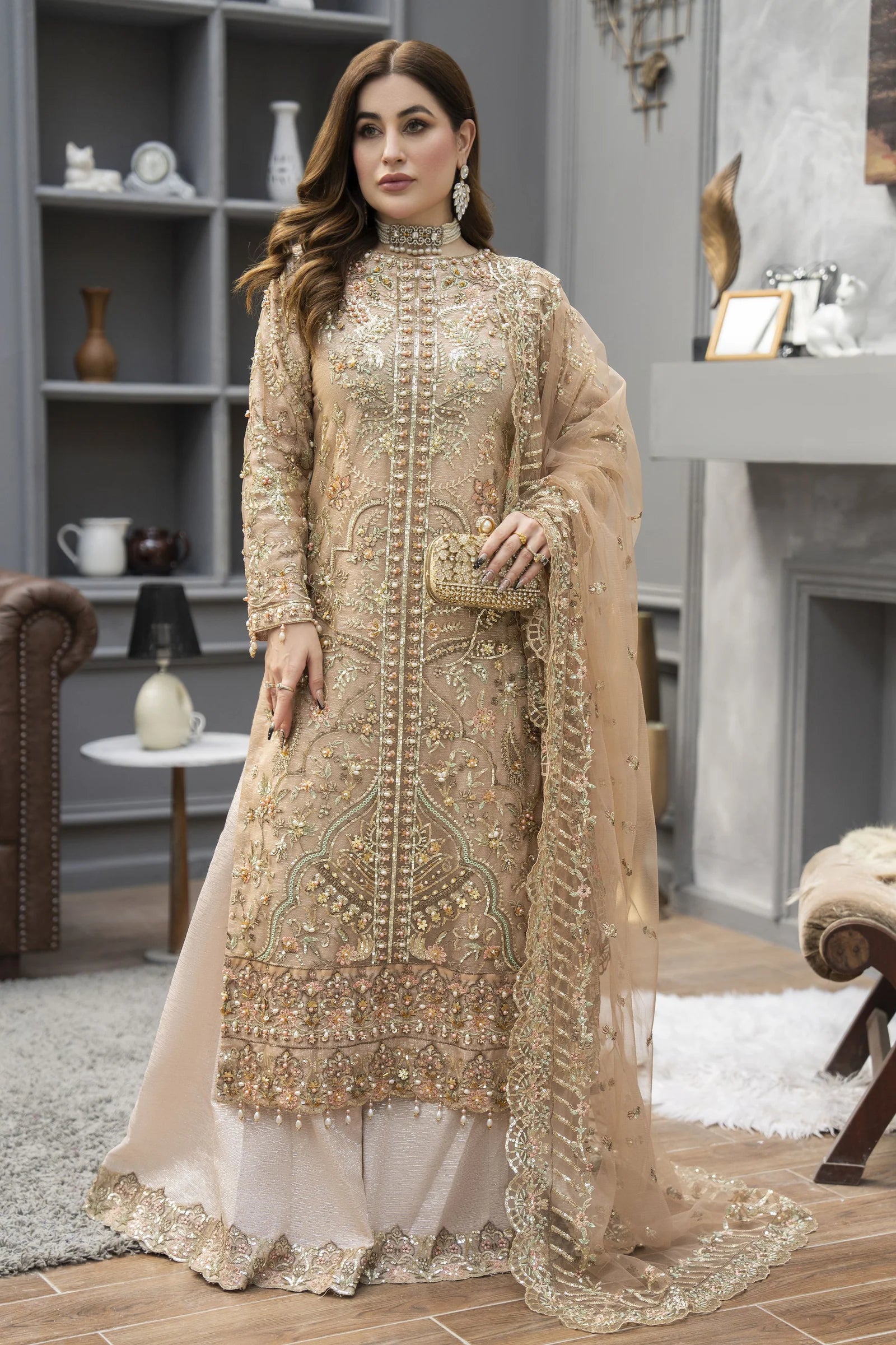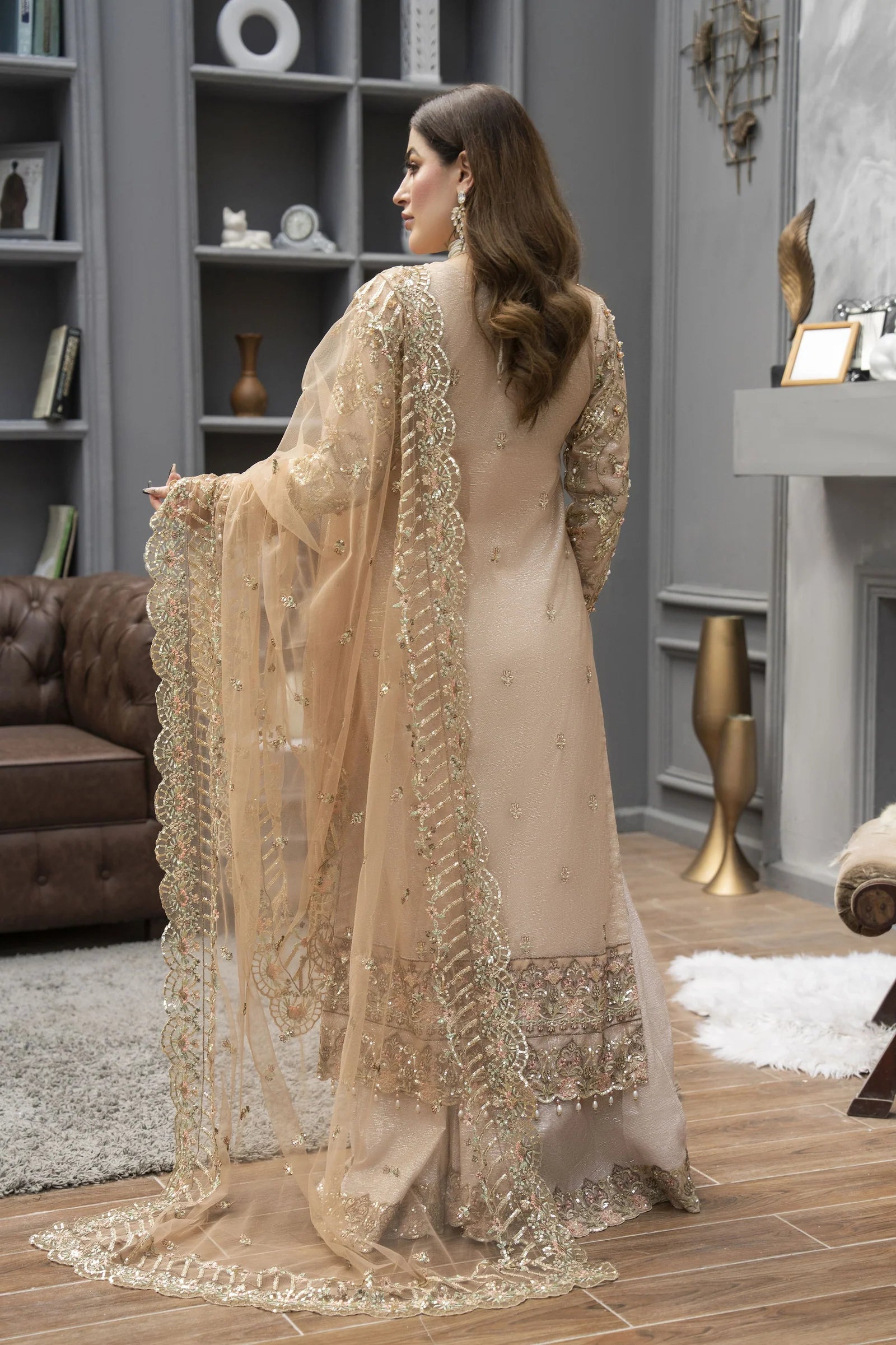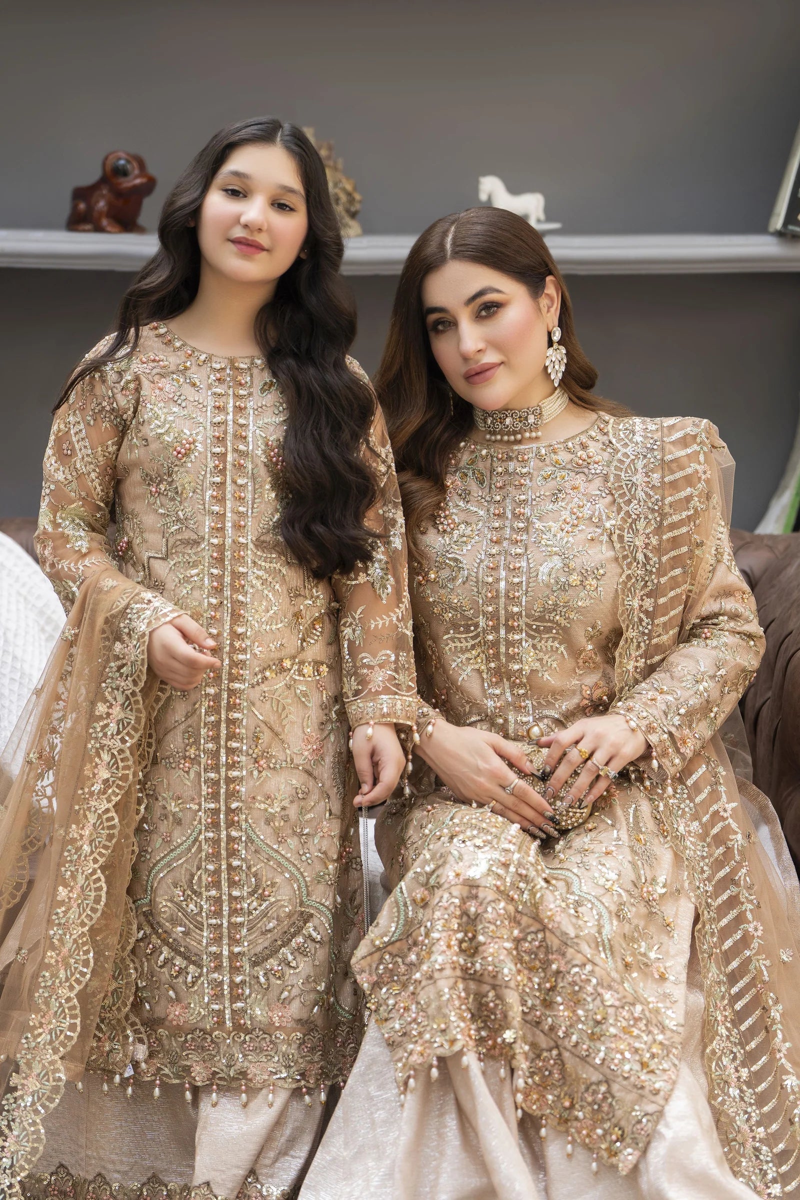 Step into timeless elegance with this breathtaking rose gold ensemble, perfect for weddings and formal occasions. The long net shirt is adorned with intricate sequin embroidery, further accentuated by delicate handcrafted adda work and pearl detailing. A shimmer lining beneath adds depth and radiance to the overall look. The coordinated net dupatta, embellished with matching sequins, drapes gracefully to elevate the ensemble's charm. Completing the look is a glamorous shimmer sequin embroidered shararah, creating a silhouette that’s both regal and fashion-forward.