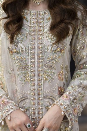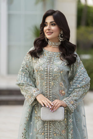 Grace meets grandeur in this mint green masterpiece from the Zaiwaraat by Arwah collection. This luxurious three-piece ensemble features a heavily embroidered net shirt adorned with sparkling sequins, exquisite handcrafted details, and delicate pearl embellishments. The shirt is layered over a shimmering attached lining, adding depth and radiance to the overall look. Paired with a matching sequin-embroidered net dupatta and a show-stopping shimmer sharara, this outfit is the epitome of festive elegance. Whether you're attending a wedding, mehndi, or evening soirée, this ready-to-wear Pakistani partywear design guarantees a glamorous entrance.