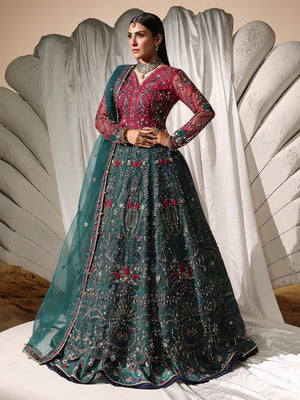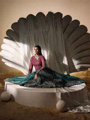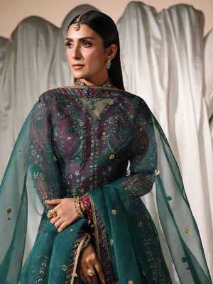 Organza lehenga, stitched with beautiful floral printed grip inner a marvel of sequin embroidery and handcrafted adda work. Pearls, gotta patti, naqshi, and dabka weave a tale of luxury, with crystals and 3D embellishments.
