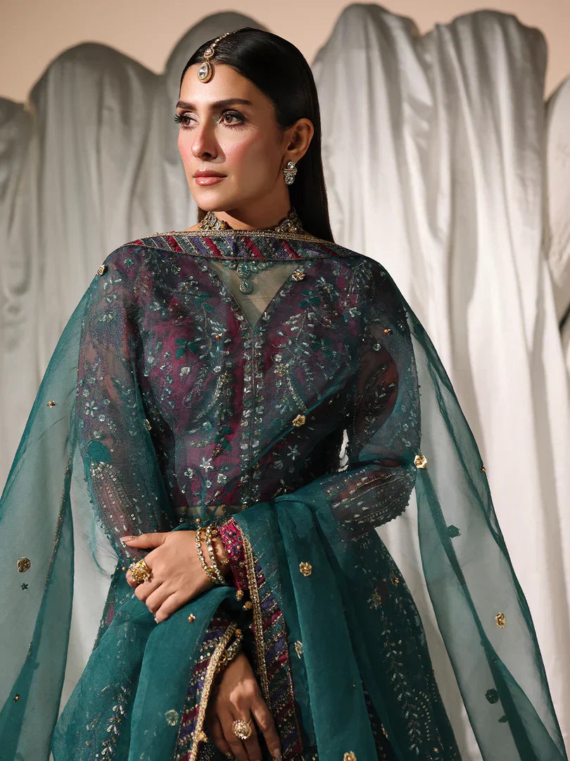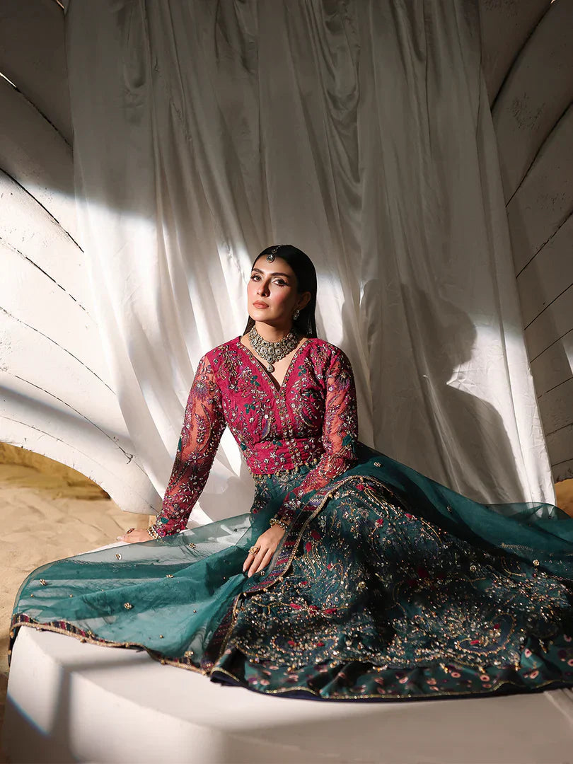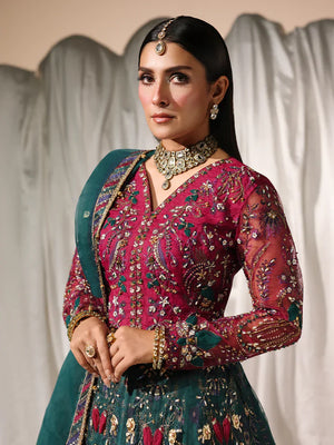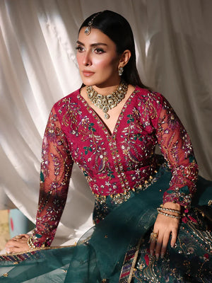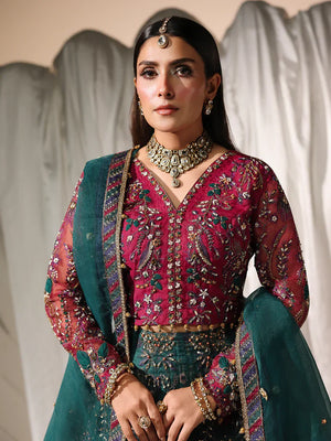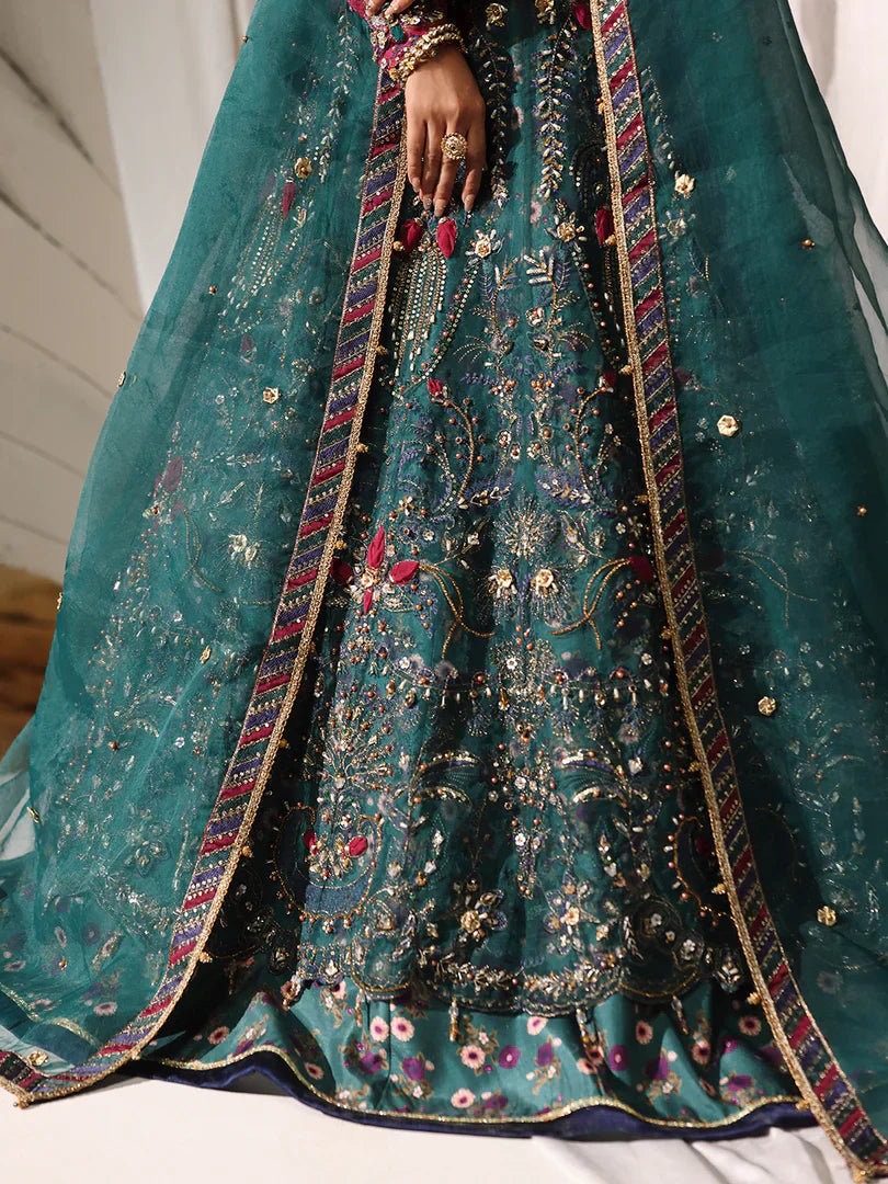 Choli of ethereal organza, adorned with spangle embroidery and the artistry of handcrafted adda work. Naqshi, dabka, pearls, cutdana, and crystals intertwine in a chainwork, while 3D embellishments and delicate tassels