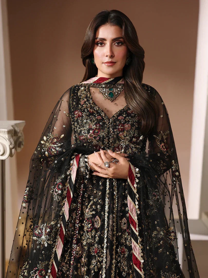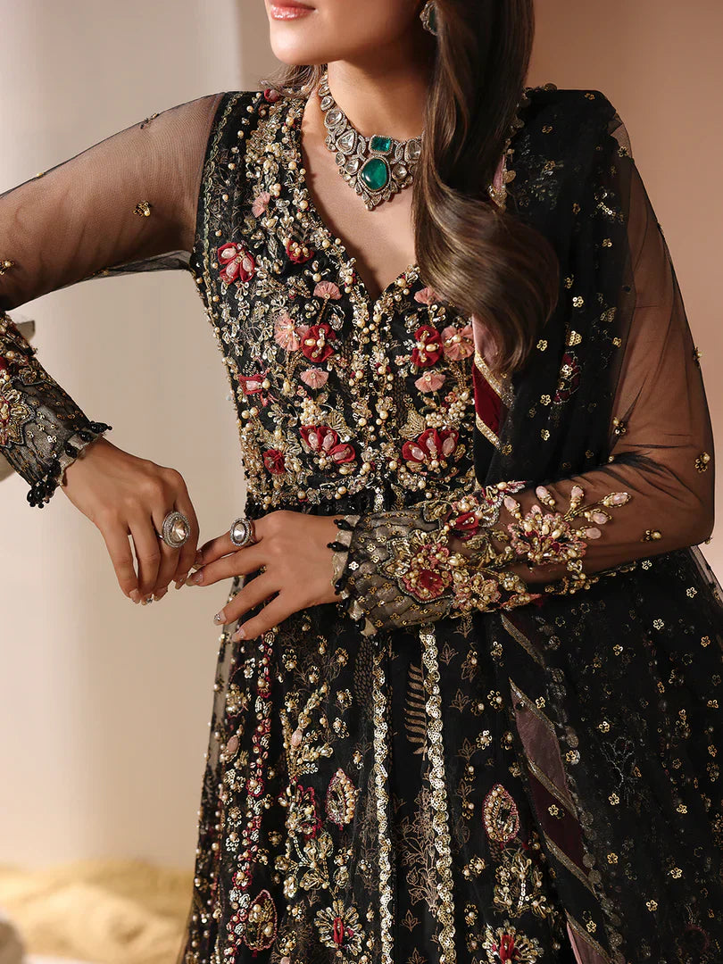 Net open maxi adorned with intricate sequin embroidery, hand-crafted adda work, naqshi dabka work, and cutdana stones.further enhanced by chainwork, crystals, and 3D floral embellishments, complemented by a viscose digital print inner layer.