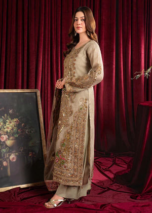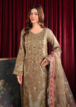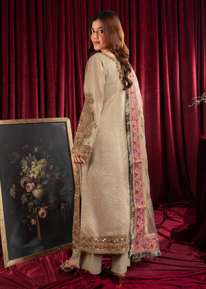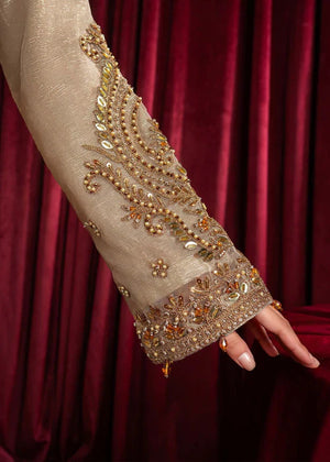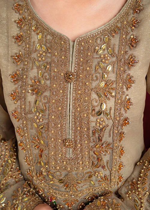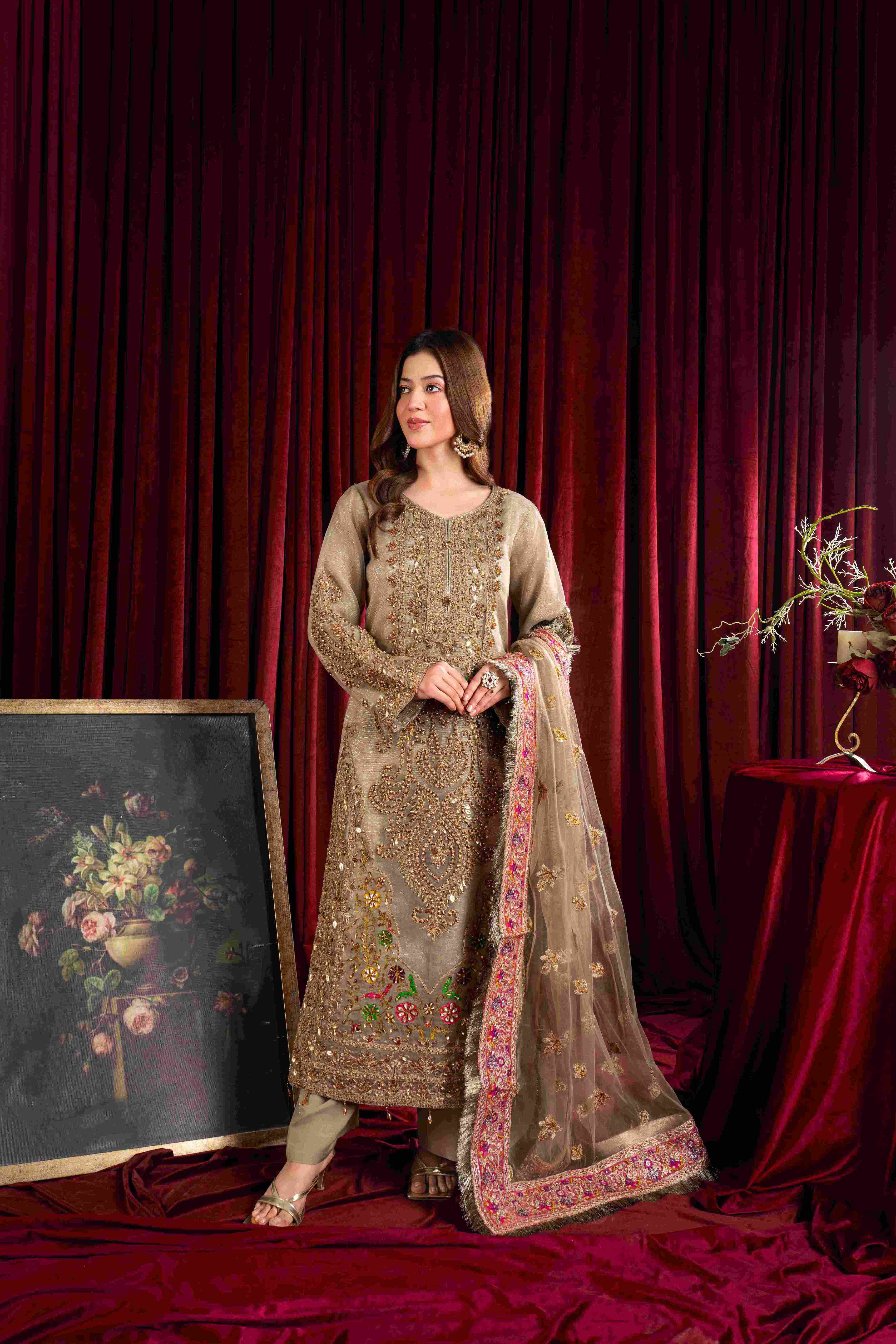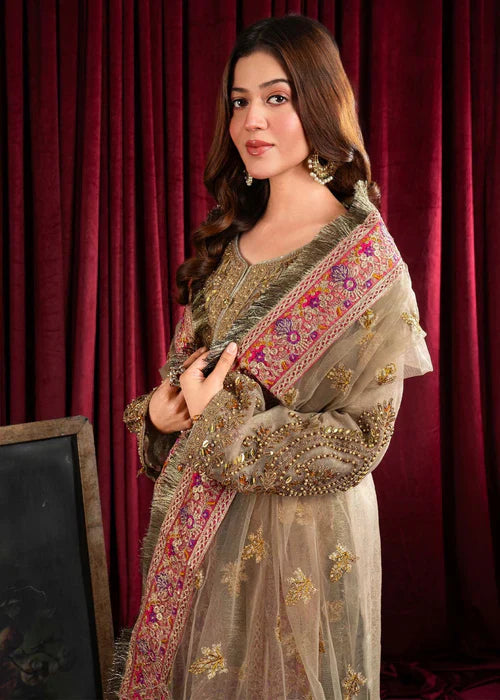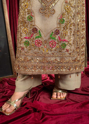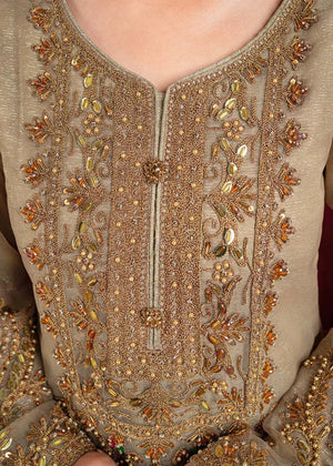 Additional Description: "*Dusty gold shirt with handmade Dori work on front with multihead *Embellishemnt on shity bottom with tussels *Embriodered sleeves with handmade work and embellishment *Embriodered 4 side border net dubatta *Viscouse trouser and viscouse lining"