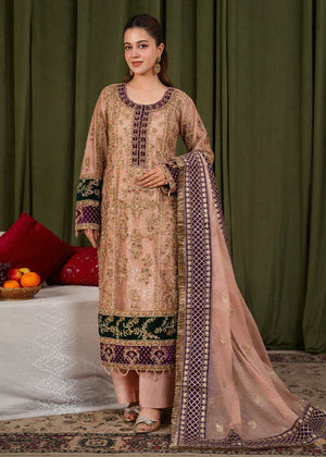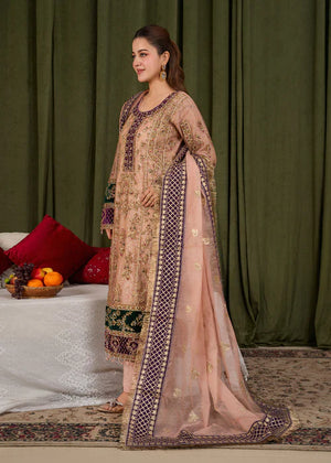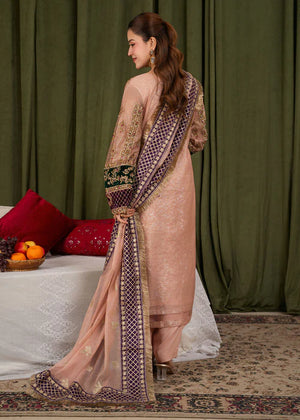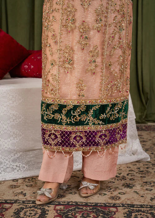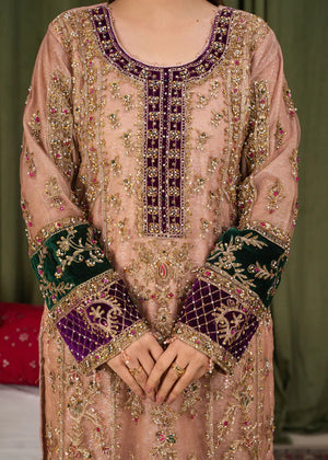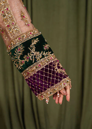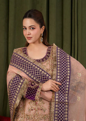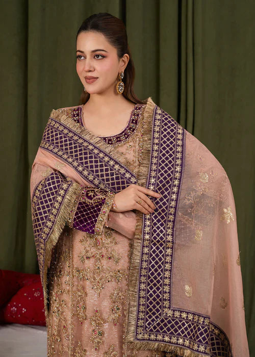* Dupatta: A standout feature of this ensemble is the heavy Khaddi net dupatta. It is richly embroidered with a wide, purple geometric border and delicate gold motifs scattered throughout, finished with a traditional gold fringe (kiran) for a classic touch.