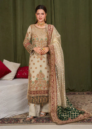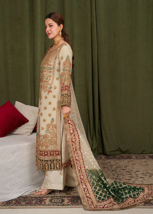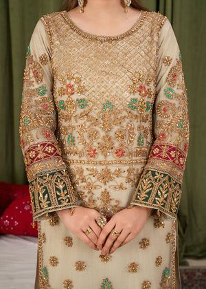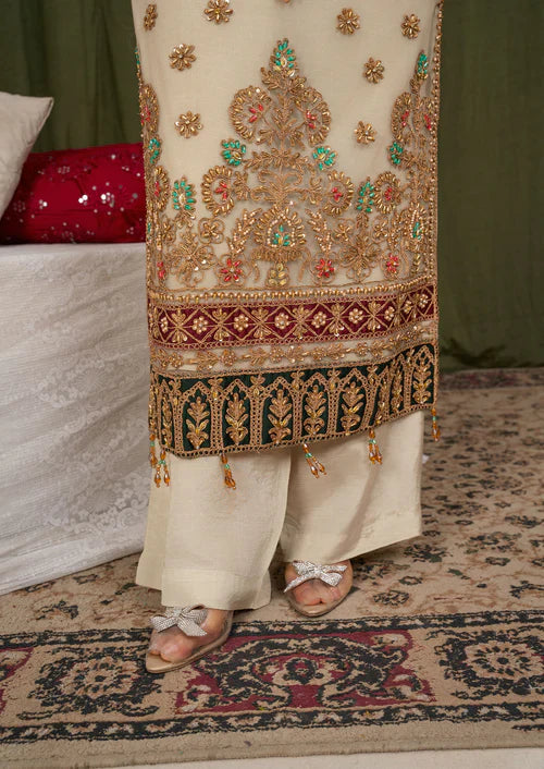 The shirt is made from premium net fabric, featuring extensive hand dori embroidery. This traditional technique creates a raised, cord-like texture that is further elevated with adda work (hand-applied crystals, sequins, and beads). Vibrant accents of emerald green and ruby red are woven into the floral motifs, while the sleeves and hem are finished with velvet-textured borders in deep maroon and forest green.