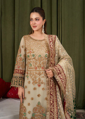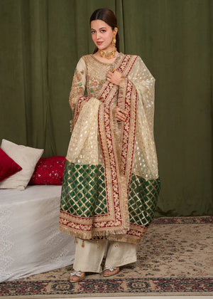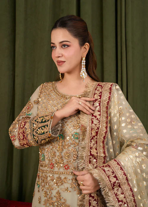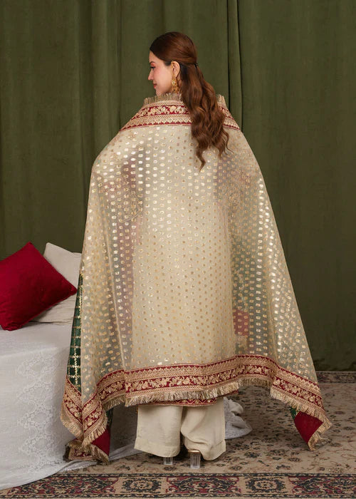 * Dupatta: The ensemble features a heavy Lurex fabric dupatta. It is adorned with a shimmering gold weave throughout and framed by a majestic four-sided maroon border with intricate gold embroidery and traditional metallic fringe (kiran) along the edges.