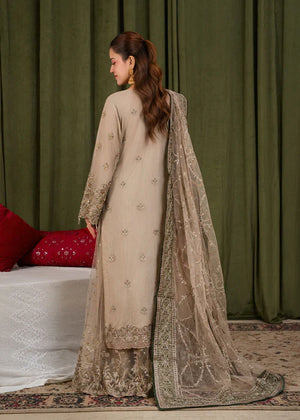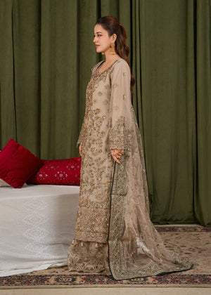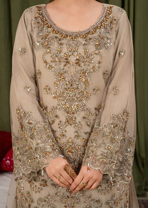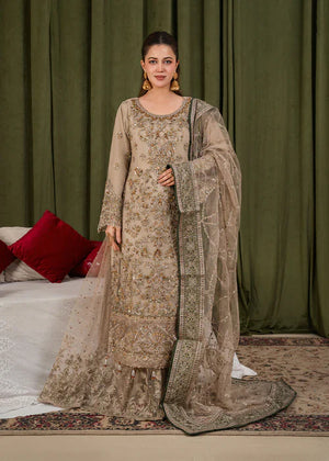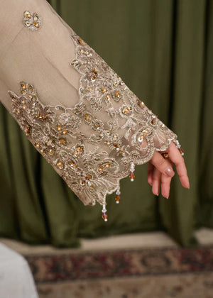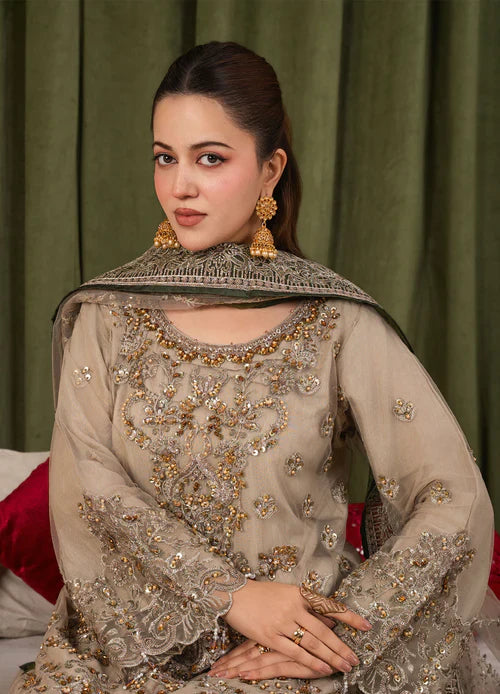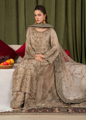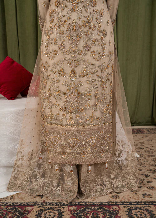 * Shararah: The outfit features a voluminous net shararah, which is meticulously embroidered to match the shirt. The flowing fabric is decorated with intricate patterns that culminate in a heavily embellished border, providing a regal silhouette.