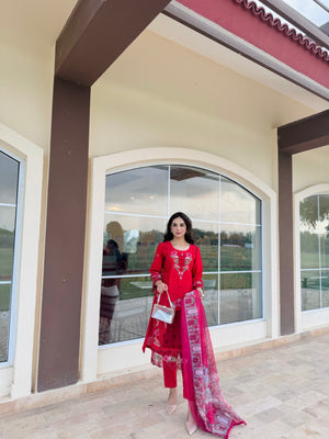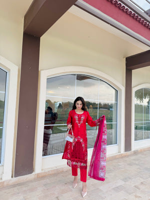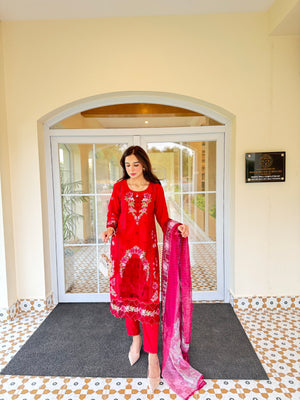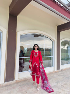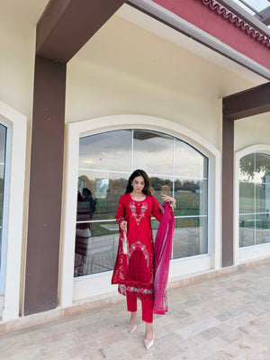 a deep red canvas with floral beige emboridery work and lace embellishment attached onto the shirt sidepanel, sleeves and trousers. Paired with a stunning net dupatta..