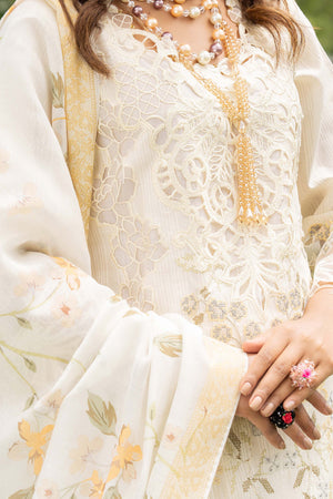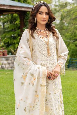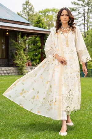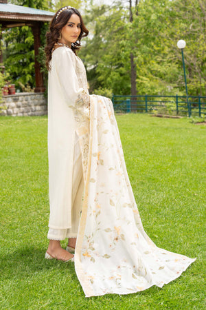 Off white emboridered shirt , with its subtle and understated charm, exudes sophistication and timelessness. The daman border, the sleeves of the outfit feature embroidered cutwork boarder made from organza fabric. Paired with a printed dupatta.