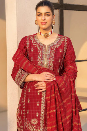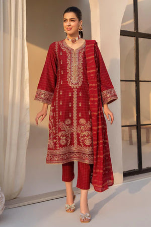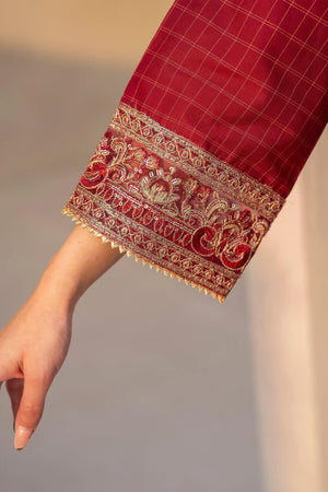 | The Scarlet Red Full Embroidery Shirt Front Panel, Plain Back Panel, Full Sleeves With Finished Embroidery Border, Front Panel Embroidery Border Patch, Calf Length, Grid Lawn trouser with Lace Trim and Dyed Dupatta |