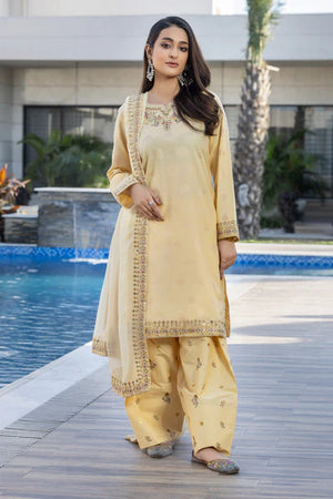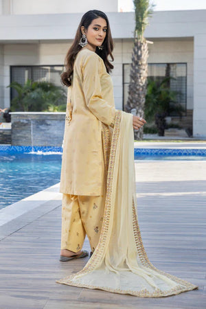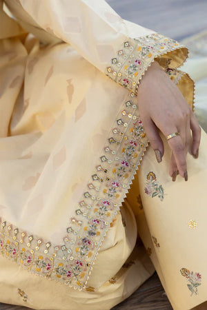 | Allover Jacquard Shirt, Embroidered Daman Patch, Embroidered sleeve border, Embroidered neckline patch, plain back.Chiffon Duppatta with four-sided Embroidered border, Embroidered Farshi Shalwar |