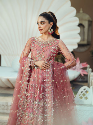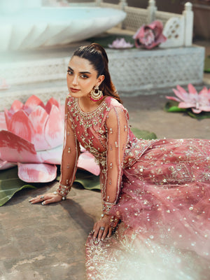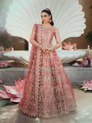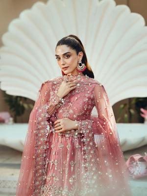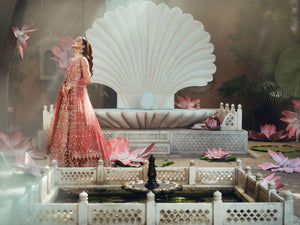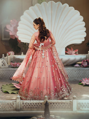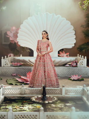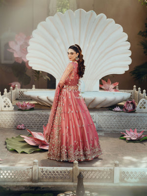 In a captivating coral pink, our signature 'ZORA' Maxi embodies femininity with its dazzling embroidery, transforming you into an ethereal beauty for weddings, formal events, or any grand occasion. Expertly crafted with 3D floral chain work, pearls, sequins, and Swarovski embellishments, this masterpiece is designed to make you shine.