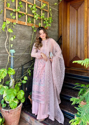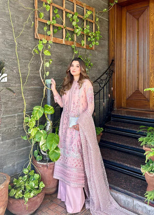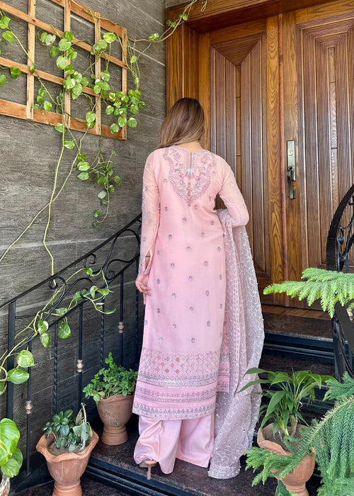 Chiffon shirt front and back with multiheaded embroidery all over it paired with trouser and beautiful organza embordered dupatta , embellished with pearl hand made on it
