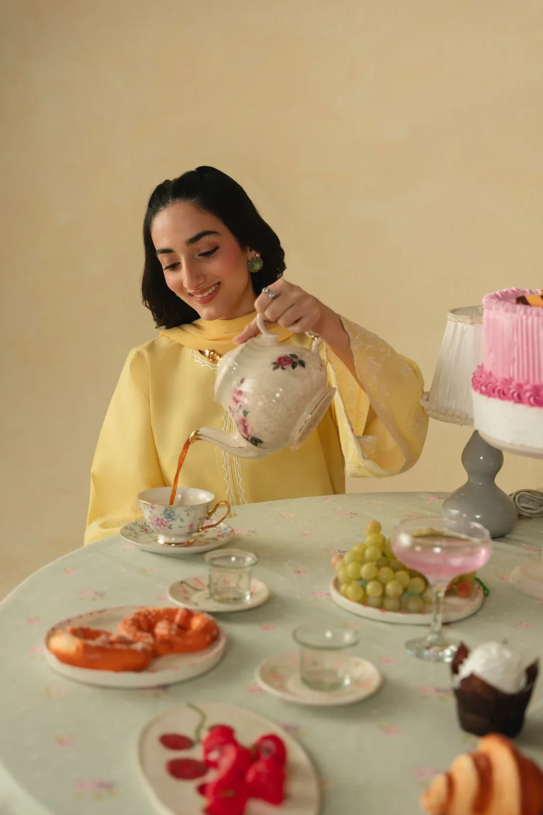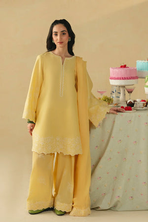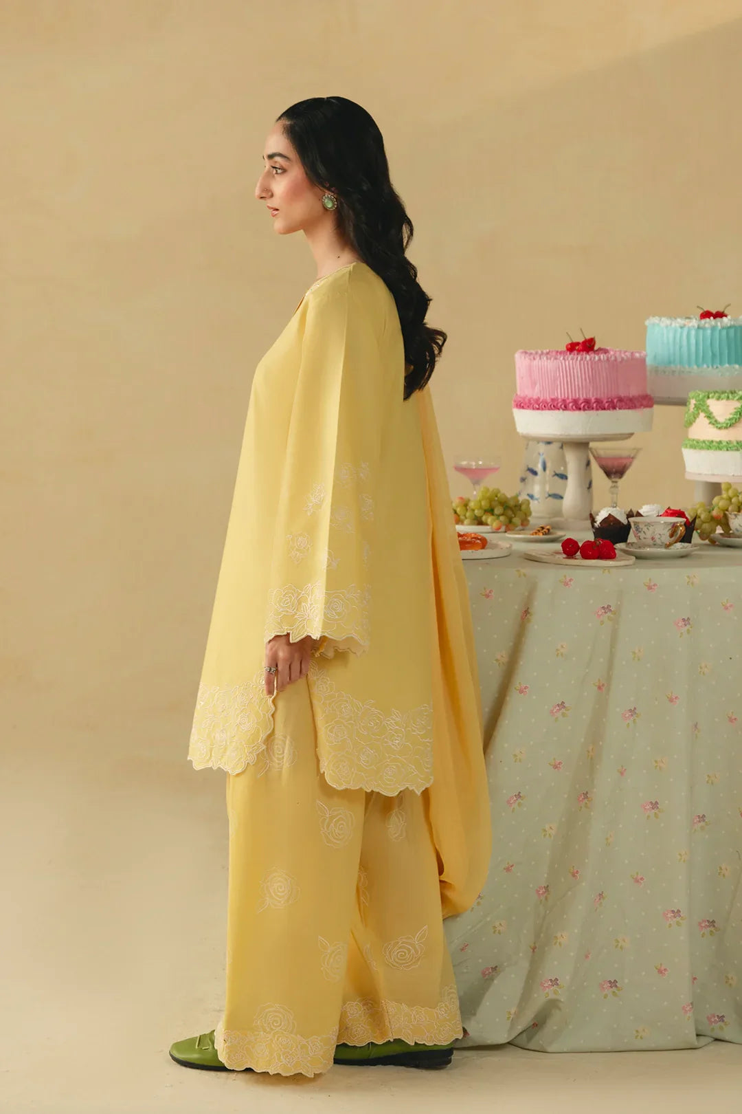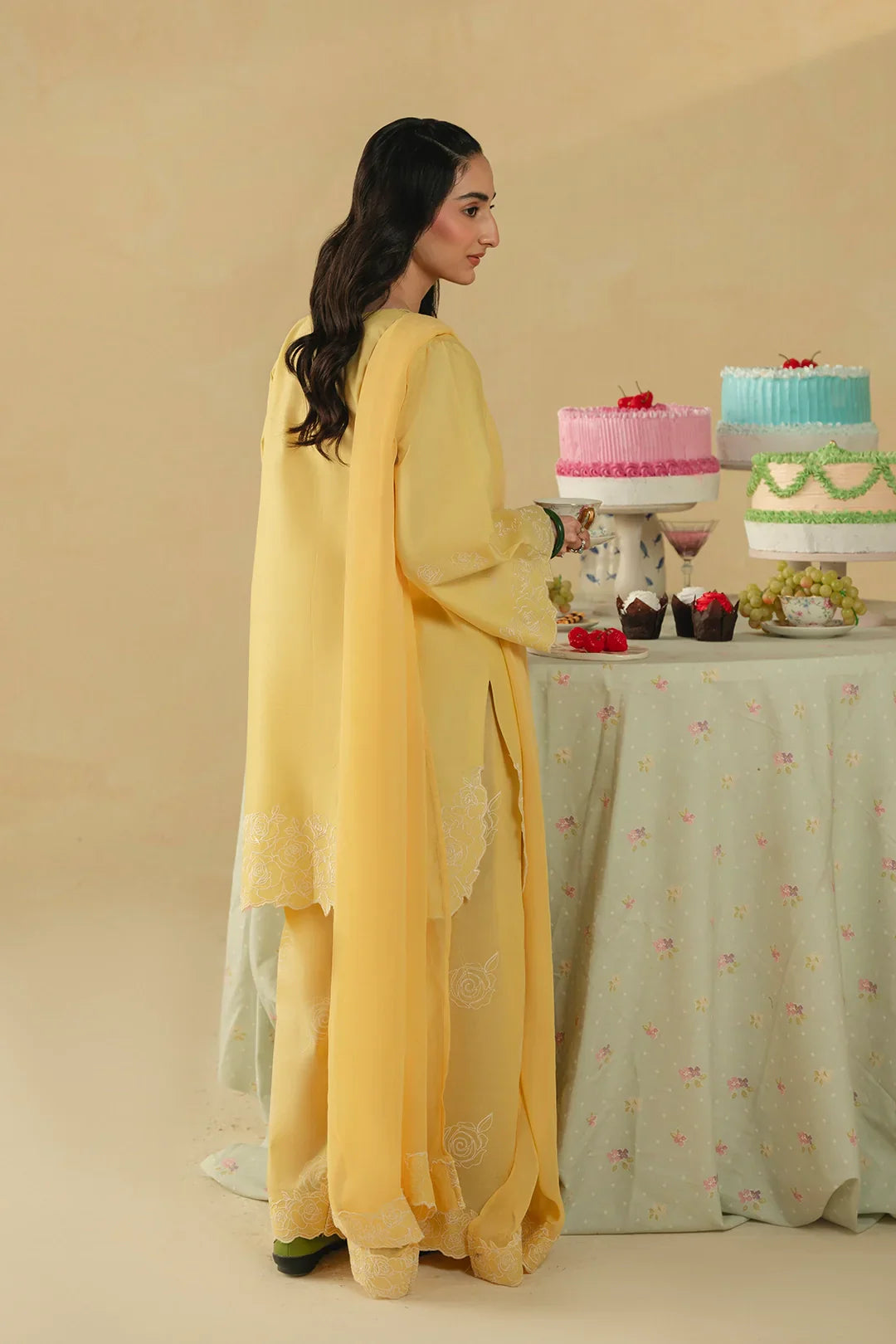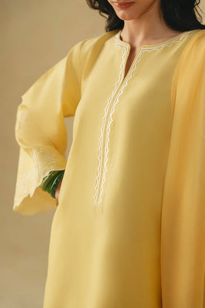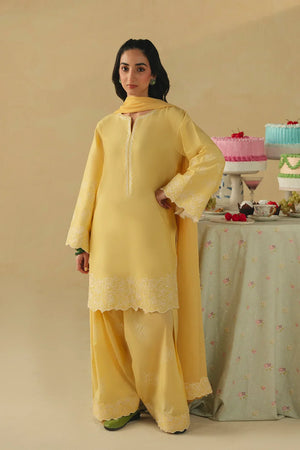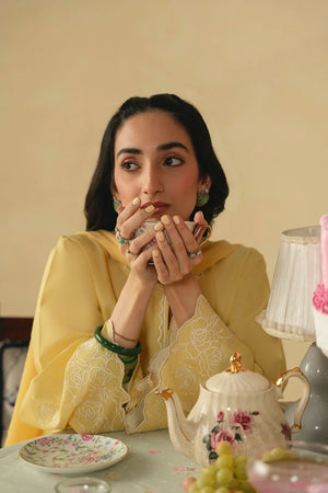 • A stunning three-piece ensemble featuring a shirt adorned with heavenly floral embroidery on the hem, scalloped neckline embroidery, and intricately embroidered sleeves. It is paired with a screen-printed and embroidered shalwar, and completed with an embroidered chiffon dupatta for a graceful and cohesive look.