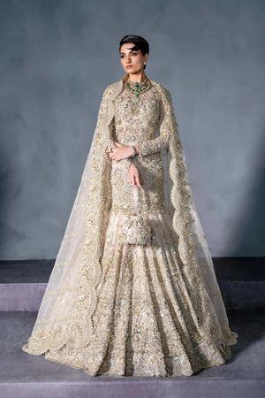 Radiate regal charm in this exquisitely detailed bridal lehenga by Akbar Aslam. Featuring a fully embellished bodice with intricate hand embroidery, crystals, and sequins, the ensemble flows into a luxuriously flared skirt adorned with shimmering gold accents. The high neckline and full sleeves offer a classic silhouette, while the scalloped dupatta drapes gracefully, enhancing the look with its ornate borders. Finished with a handcrafted pouch and styled with statement emerald jewelry, this look is a perfect fusion of traditional splendor and modern sophistication—ideal for the bride who seeks timeless elegance on her big day.