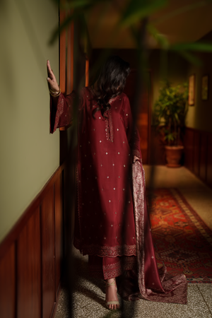 The 3-piece ensemble includes a beautifully embroidered shirt, a complementing plazo tailored for effortless elegance, and a coordinated dupatta that completes the festive look. Designed to transition seamlessly from intimate gatherings to formal celebrations, Aurelia is a statement of refined taste and elevated style.