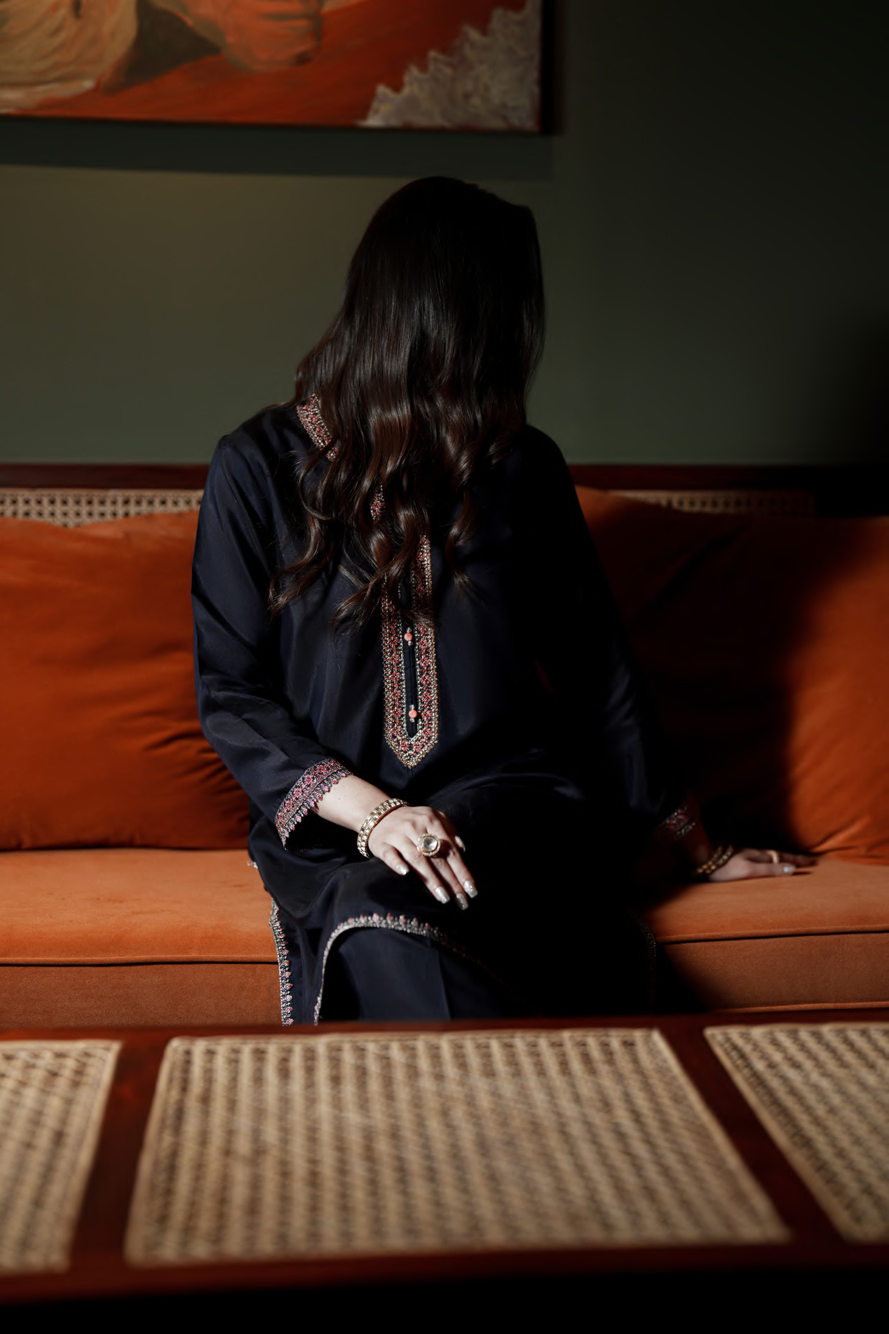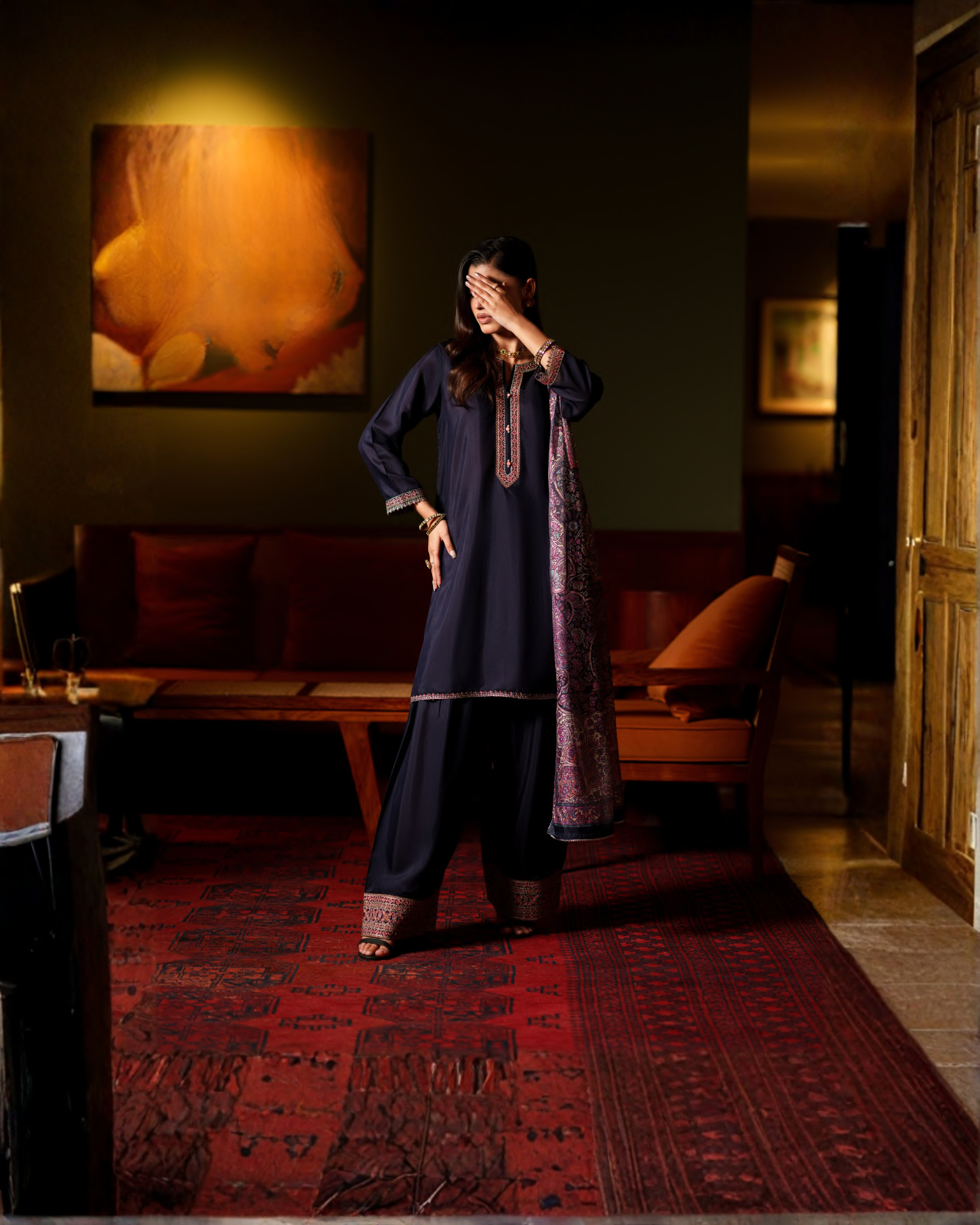This refined 3-piece ensemble features an exquisitely embroidered shirt, a statement farshi shalwar that brings traditional grandeur with a contemporary touch, and a perfectly coordinated dupatta to complete the silhouette. Designed for graceful movement and regal presence, Aurelle is ideal for soirées, festive evenings, and elegant celebrations.