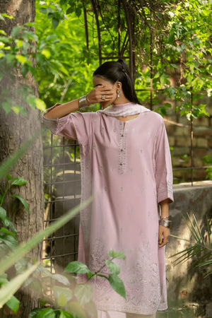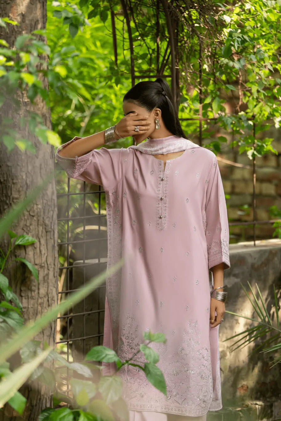 A soft pastel pink ensemble that embodies serenity through exquisite craftsmanship. Intricately embroidered with silver threadwork, it radiates a subtle, luminous charm under daylight.