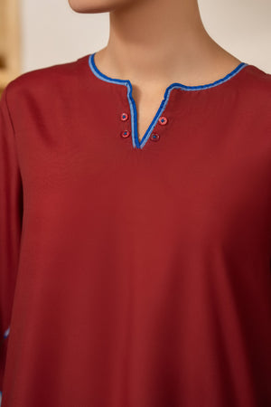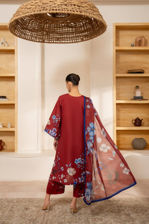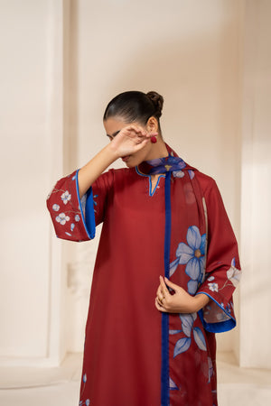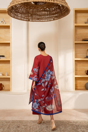 Drape yourself in effortless elegance with Crimson Bloom — a rich maroon ensemble adorned with delicate blue and ivory florals.
