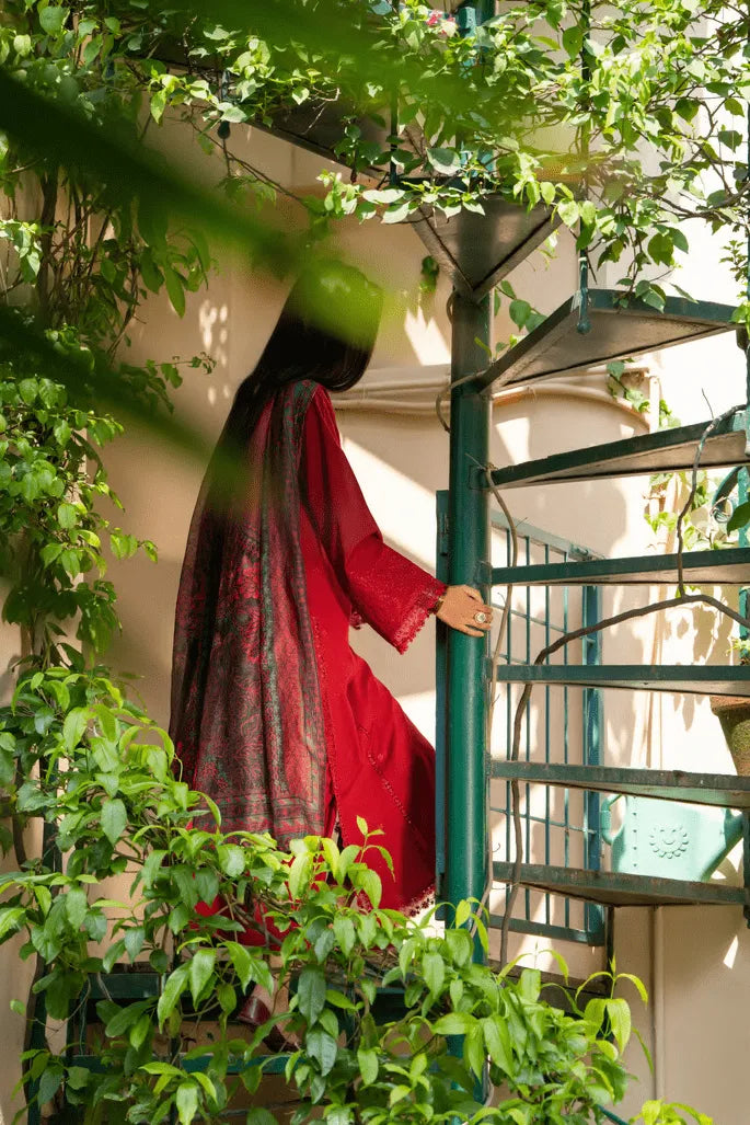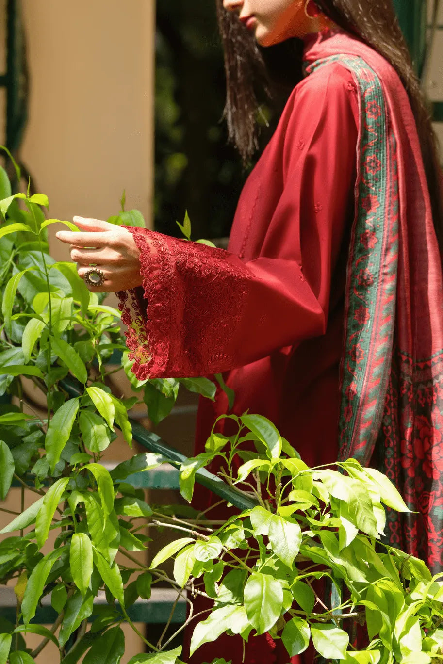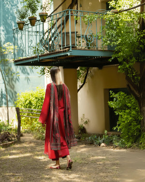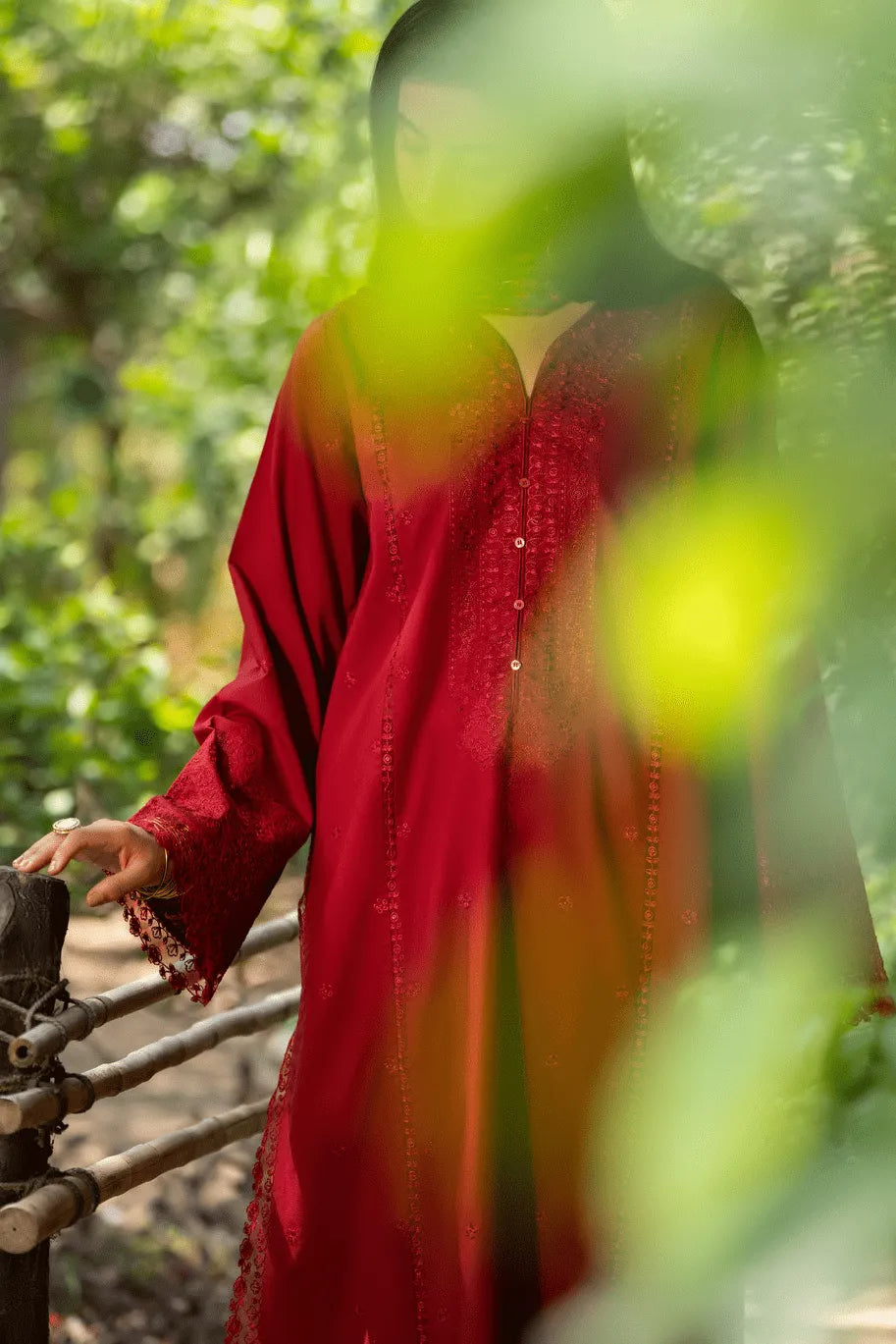 A rich deep red ensemble that beautifully blends traditional craftsmanship with modern refinement. Delicate embroidery graces the neckline and sleeves, adding a touch of artisanal texture and timeless elegance.