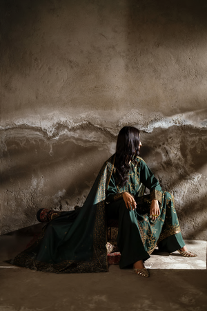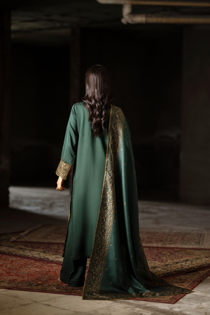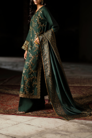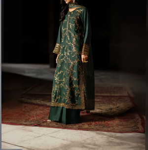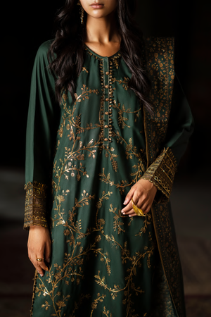 This regal emerald green formal ensemble beautifully fuses tradition with refined elegance. Tailored from luxurious fabric, the long straight kameez is embellished with intricate golden zari and delicate thread embroidery in graceful floral vine motifs, radiating a timeless allure.