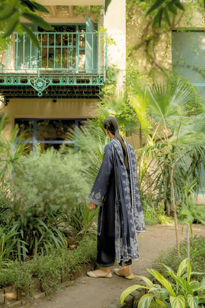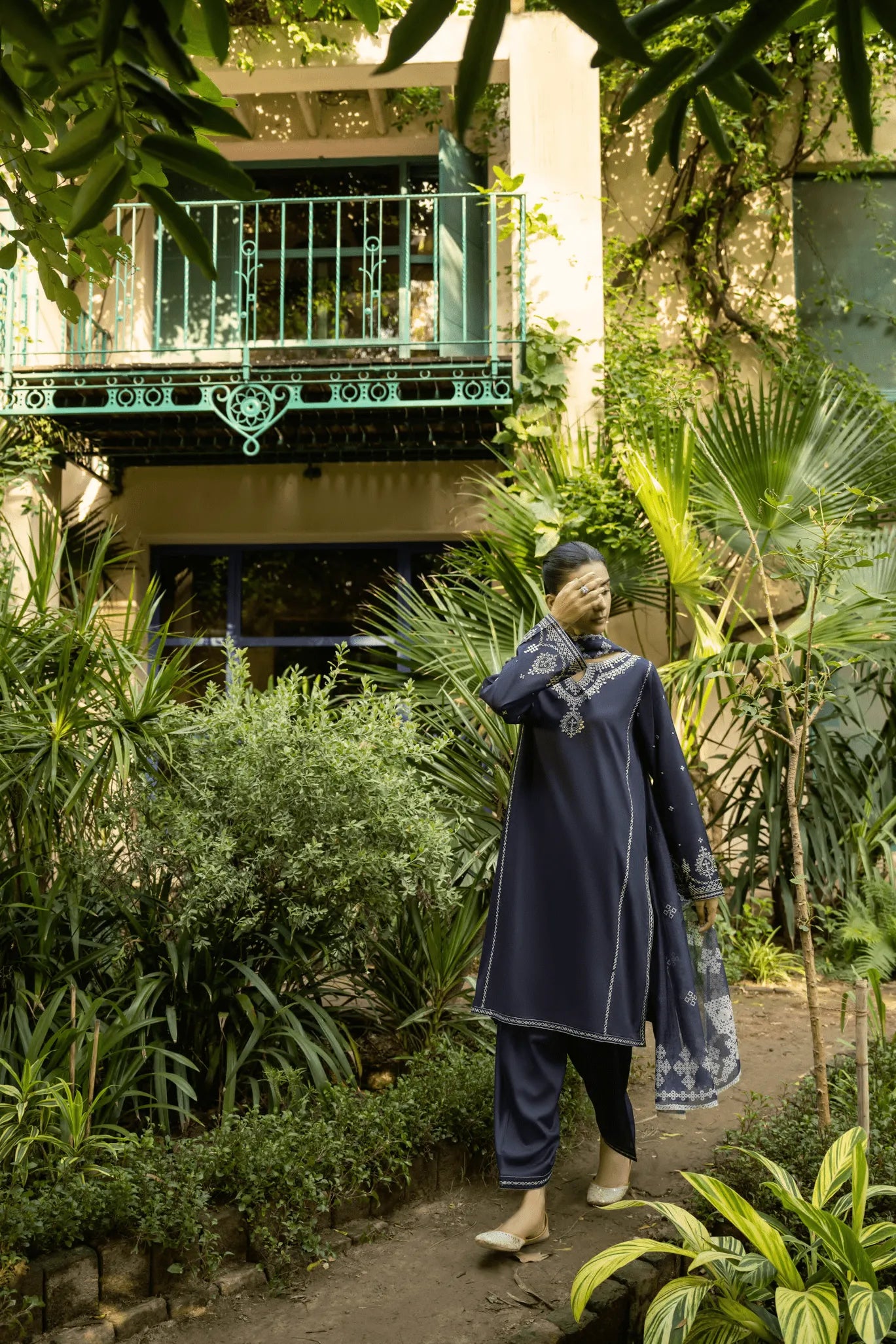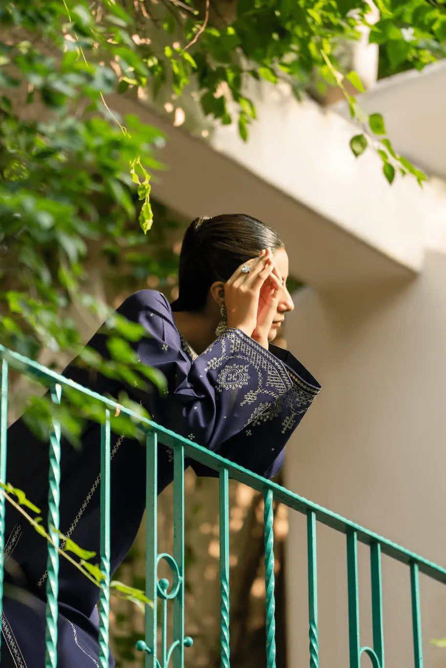 A deep navy ensemble enlivened with intricate ivory embroidery and refined geometric motifs. The design seamlessly fuses classic Eastern detailing with a sleek, contemporary silhouette.