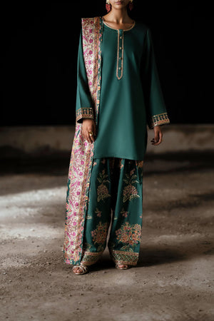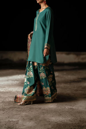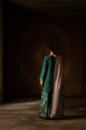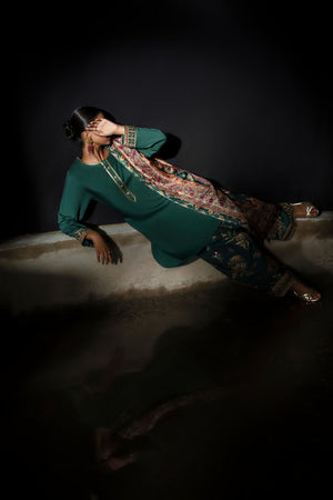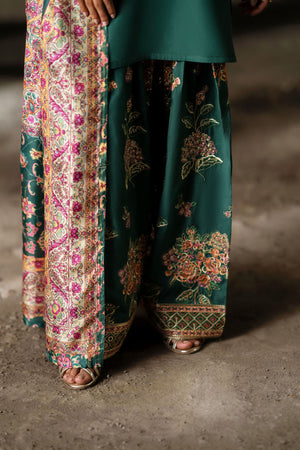 The plain green kameez, defined by its clean neckline and subtle embellishments, creates a harmonious balance with the ornate dupatta and floral-embroidered trousers—a timeless fusion of simplicity and opulence. Its silky drape lends graceful fluidity, while the intricate prints weave in a touch of heritage charm.